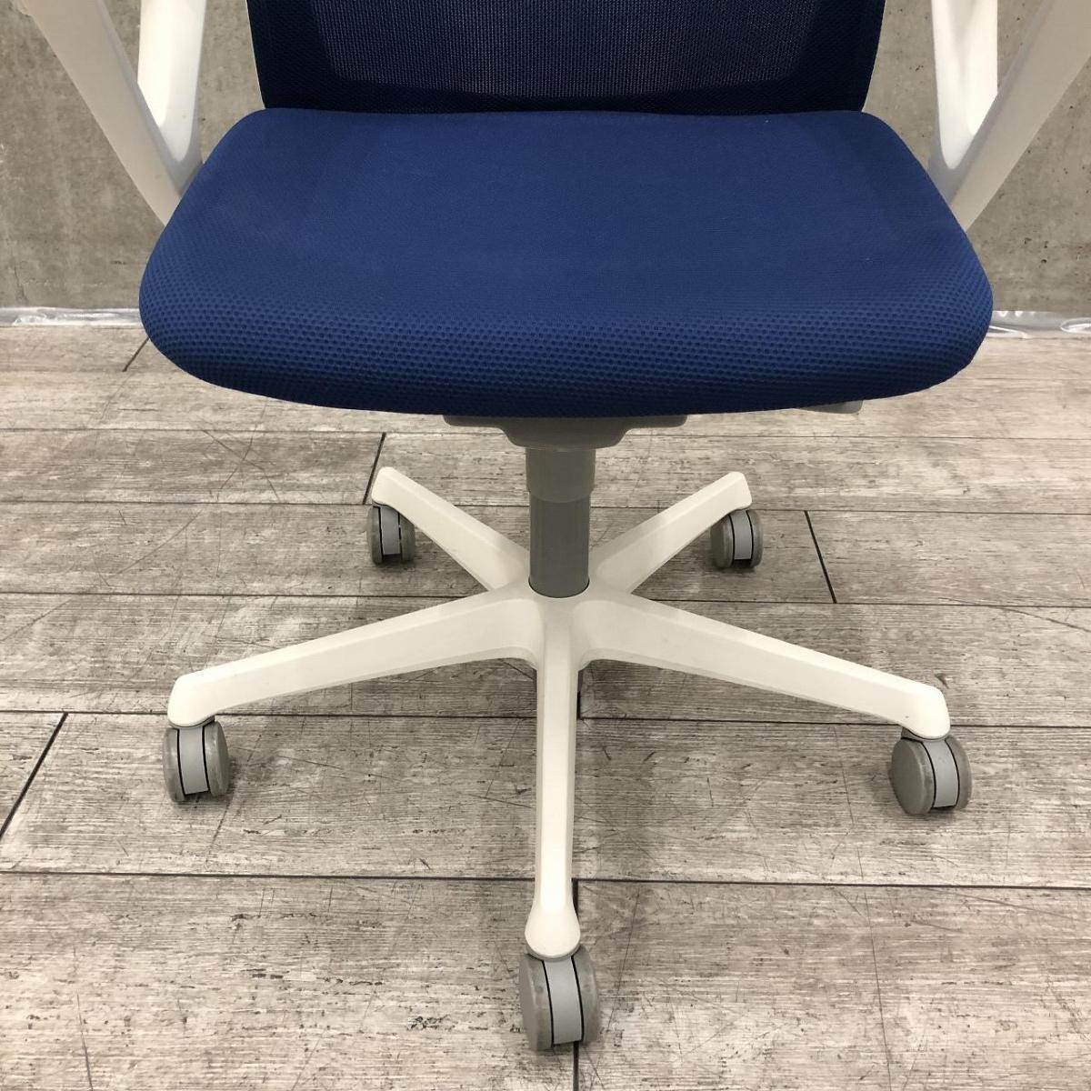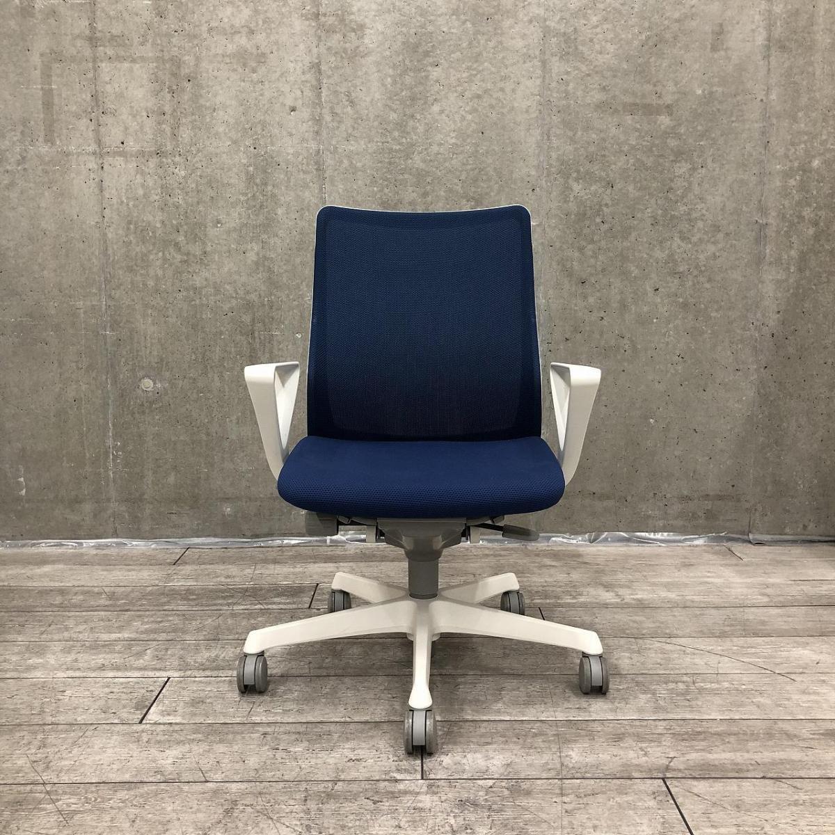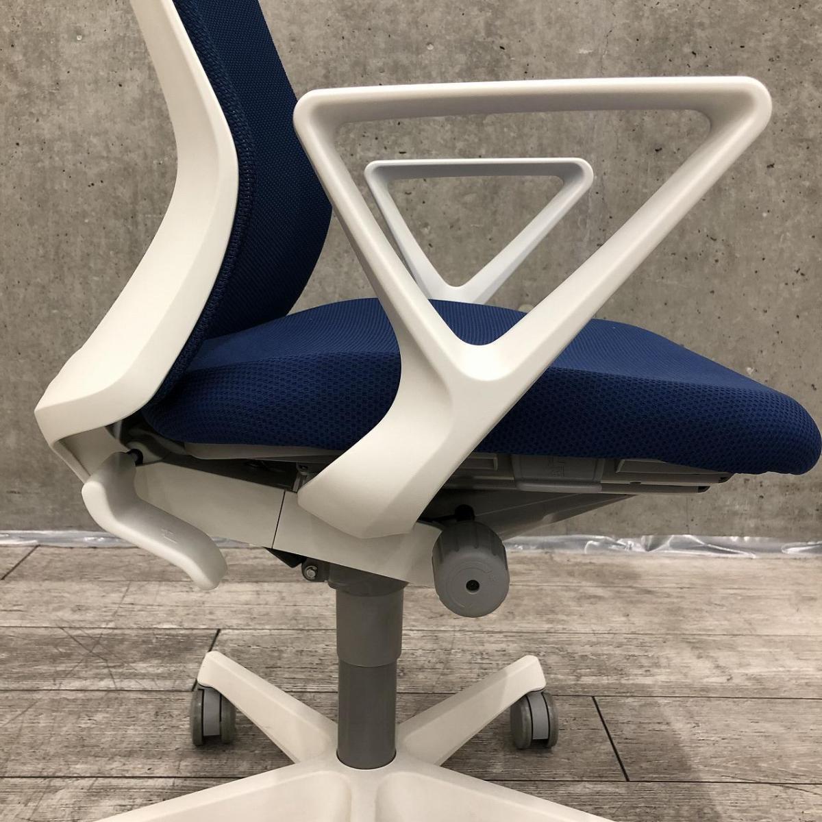 ★オカムラ製 フルーエント ミディアムブルー ホワイトフレーム 肘付き ローバック 背面メッシュ デザインアーム※固定肘 樹脂脚 腰まわりをしっかりホールド! 長時間作業も快適フィット! 肘付きローバックチェア!!