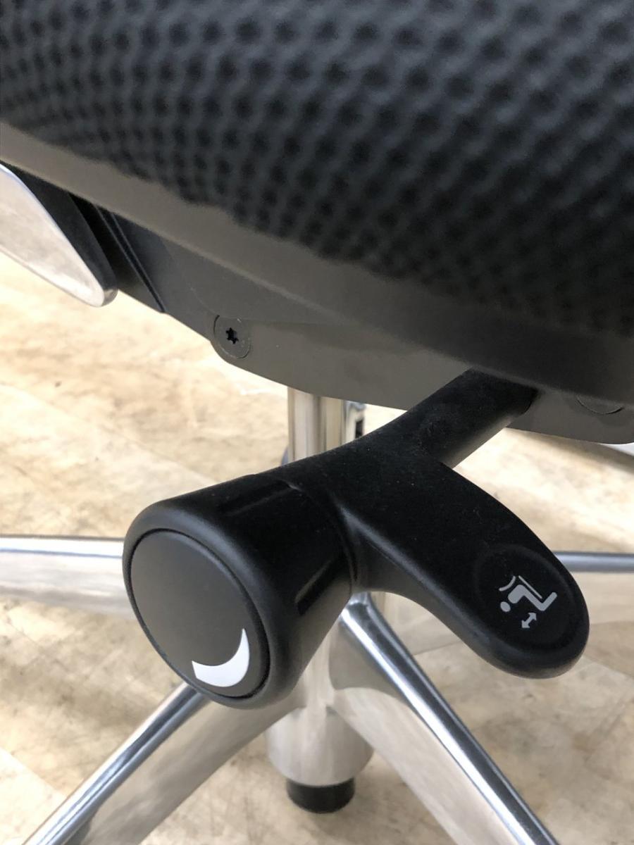 - 椅子と背が連動する「シンクロリクライニング」。リクライニング角度は直立ポジションから前方に10度、後方に23度です。