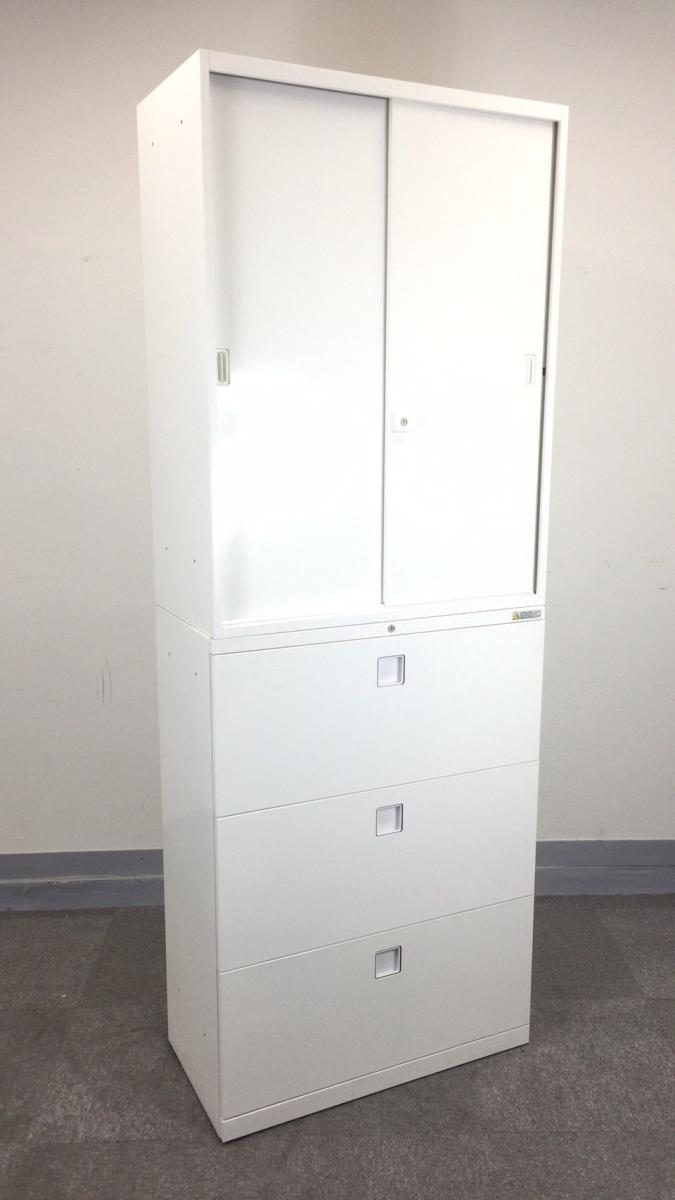 【オフィスの書類をまとめて整理!引き違いと引き出し式の書庫セット!】■オカムラ(okamura)製 レクトラインシリーズ 引き違い+3段ラテラル 上下書庫セット 3枚扉 H2150㎜ ■シリンダー錠 ■ホワイト