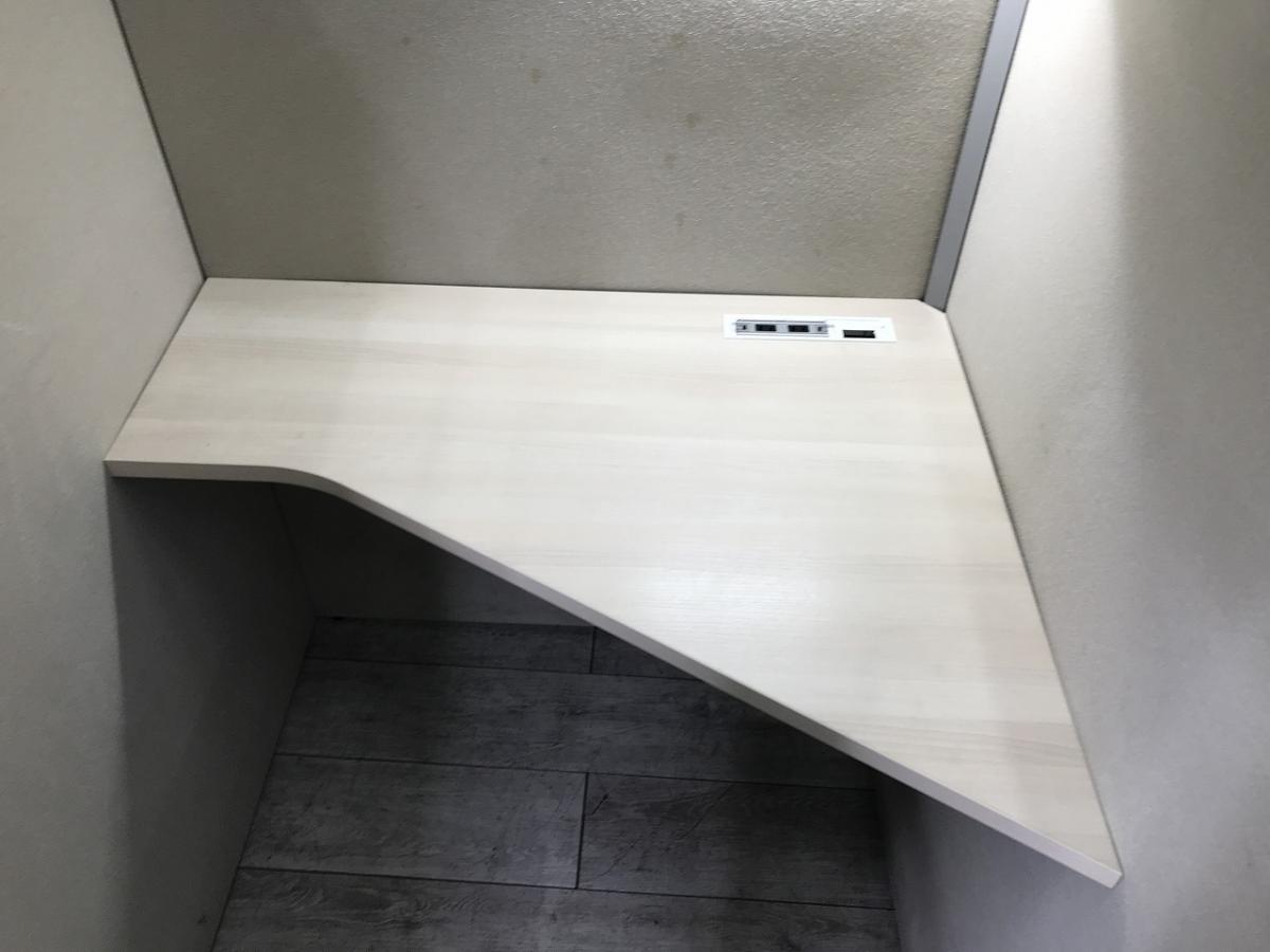 視線がブースの角に向かい、周囲の人の動きが視界に入りにくくなるようにデザインされたワーク天板。