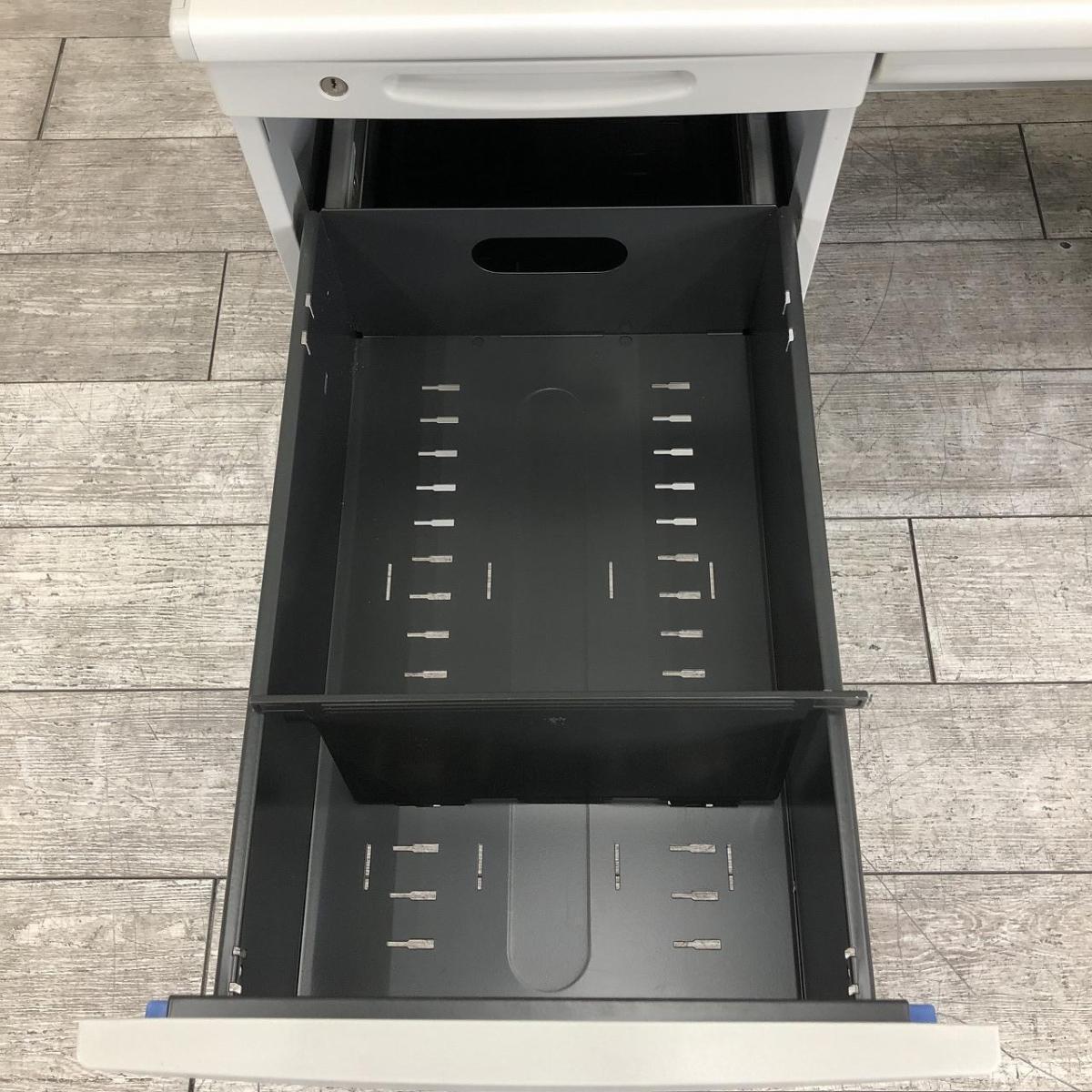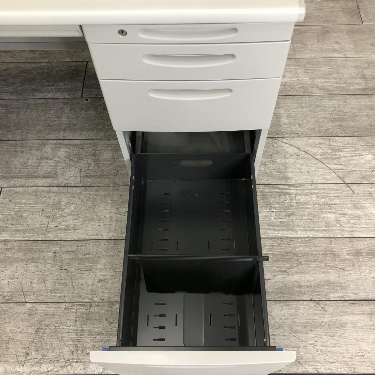 - 袖机のワゴンは、最下段がロング引出しになっており、従来より収納力120%アップ。