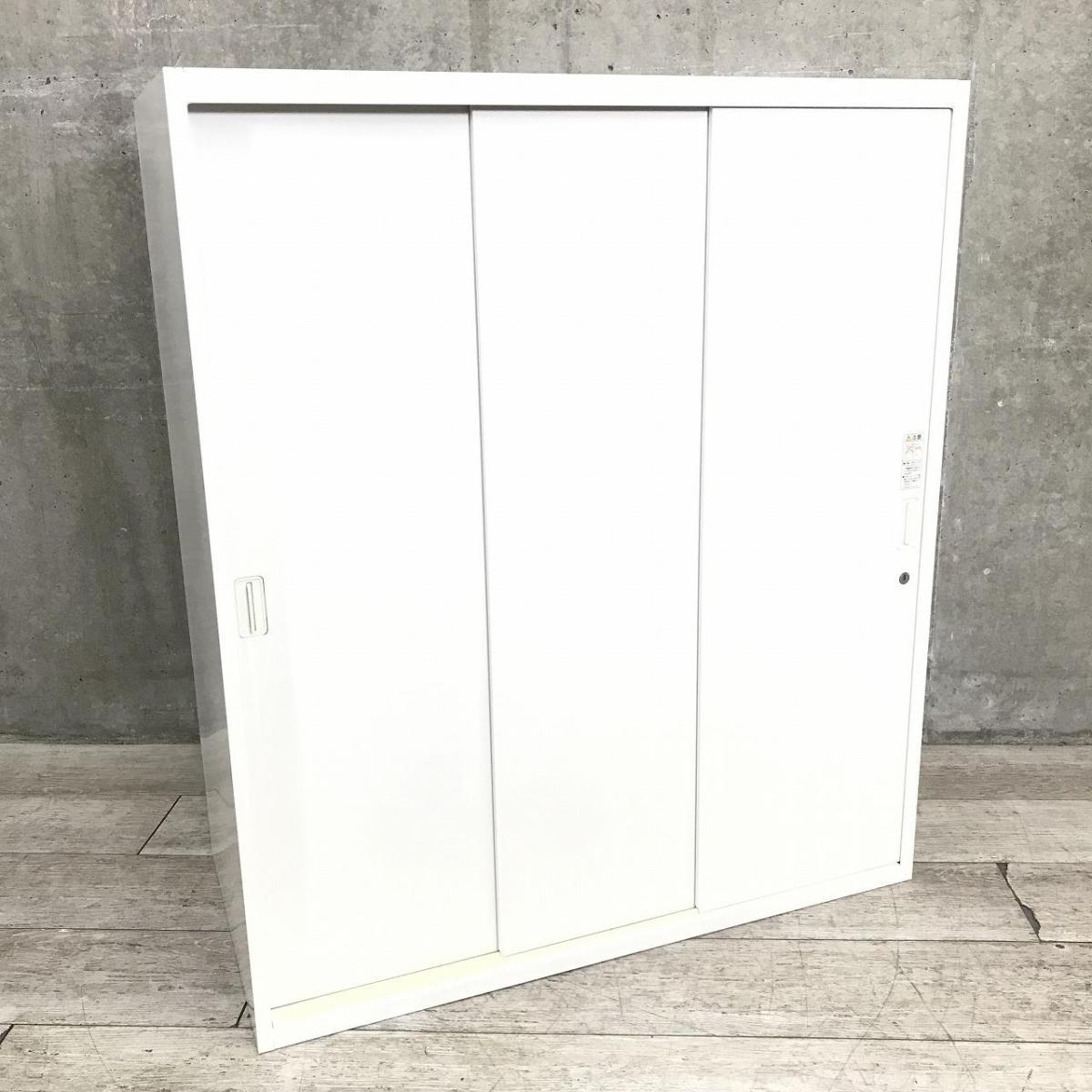 【物が取り出しやすい3枚引き違いタイプ!開閉スペースに困らない!】■オカムラ(okamura)製 レクトラインシリーズ 引違い書庫 3枚引き戸 ローキャビネット ■シリンダー錠 ■ホワイト- つくば店