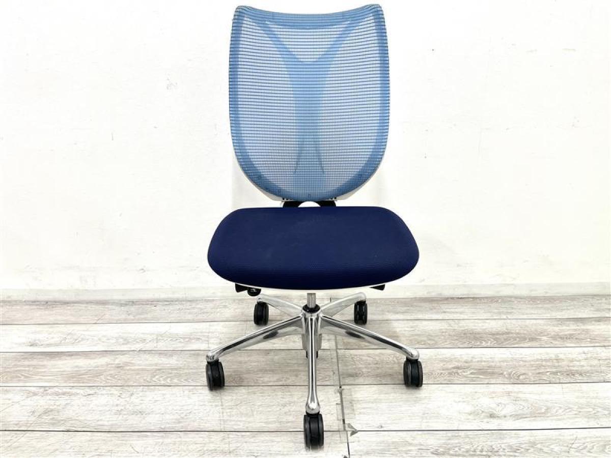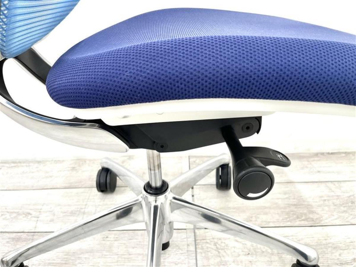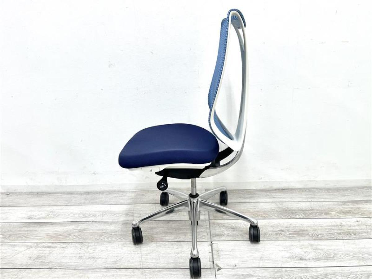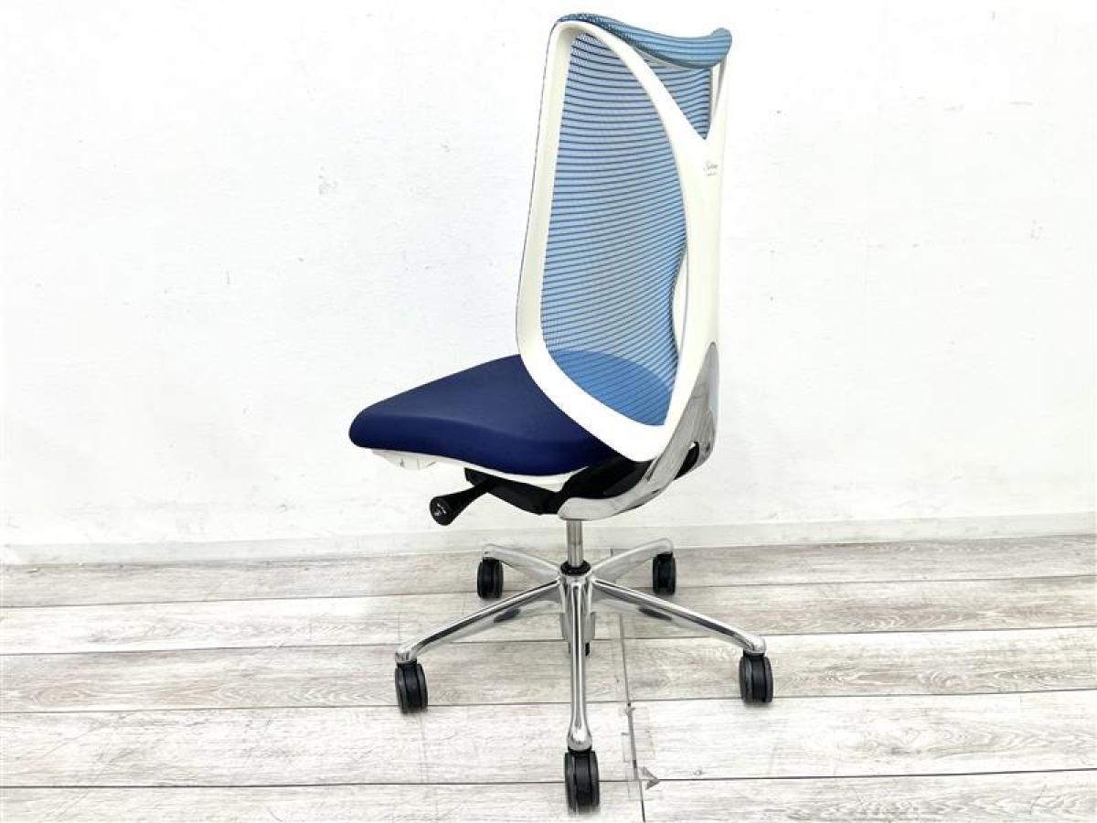 【T9】オカムラ製 サブリナシリーズ アクアブルー 背もたれ/アクアブルーx座面/ダークブルーのツートンカラー ホワイトフレーム 前傾チルト付 流れるような美しいフォルムの最高級メッシュチェア! 肘無しハイバックチェア!!