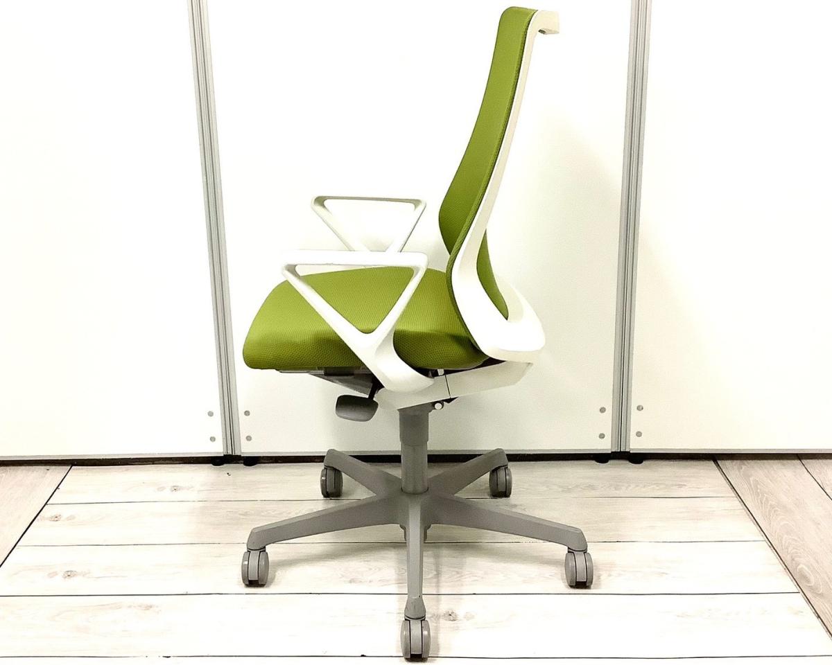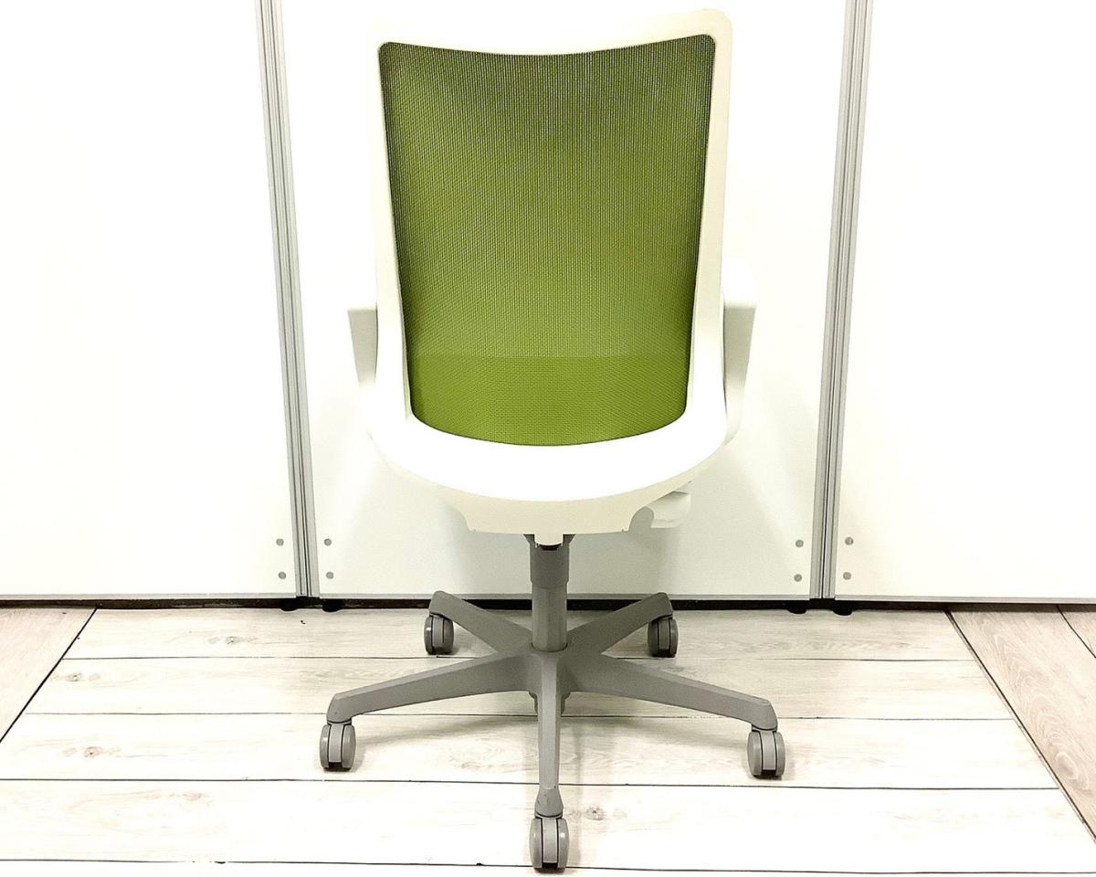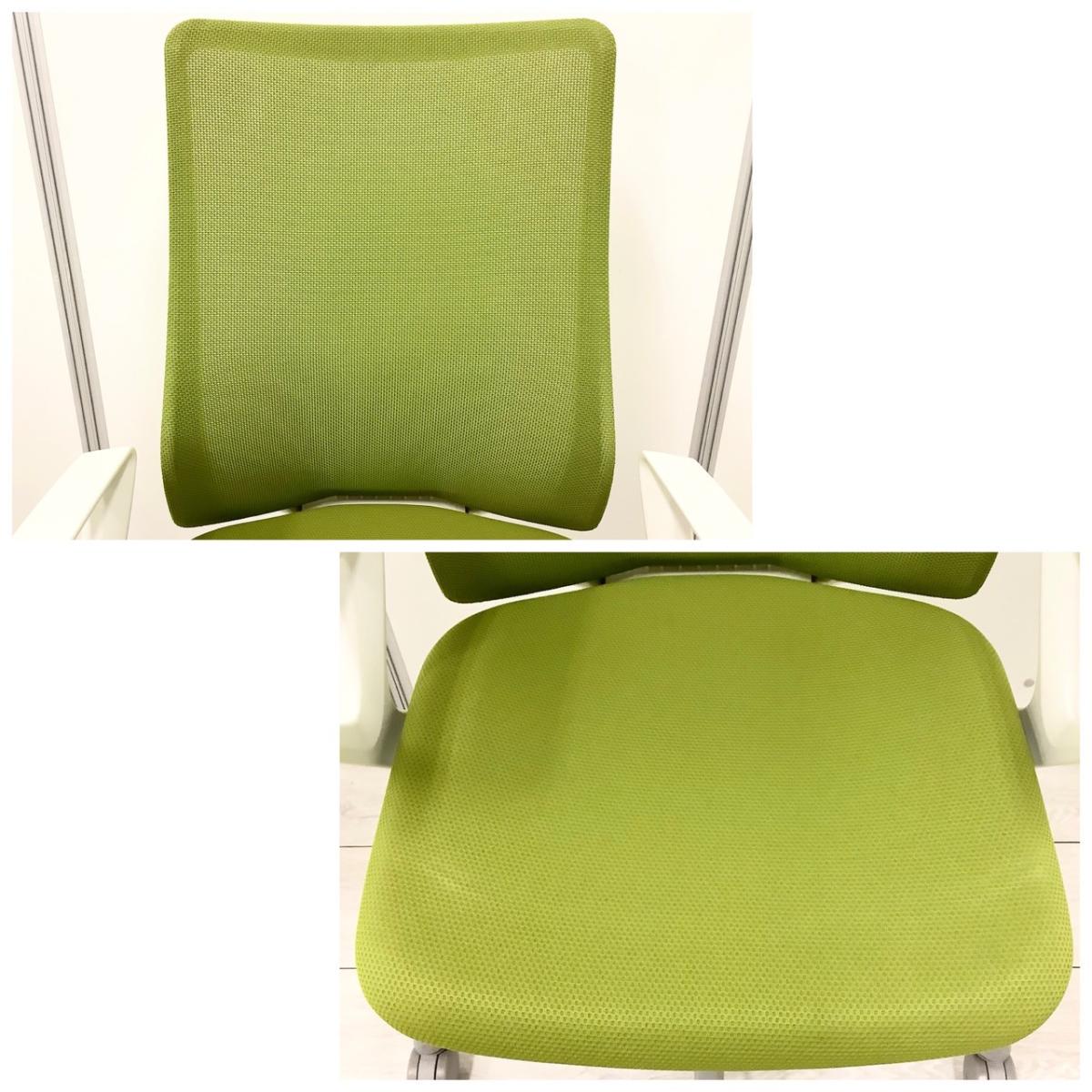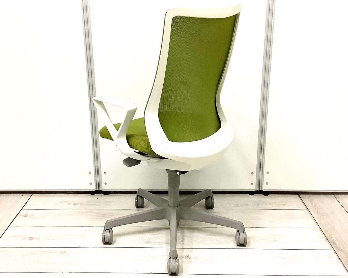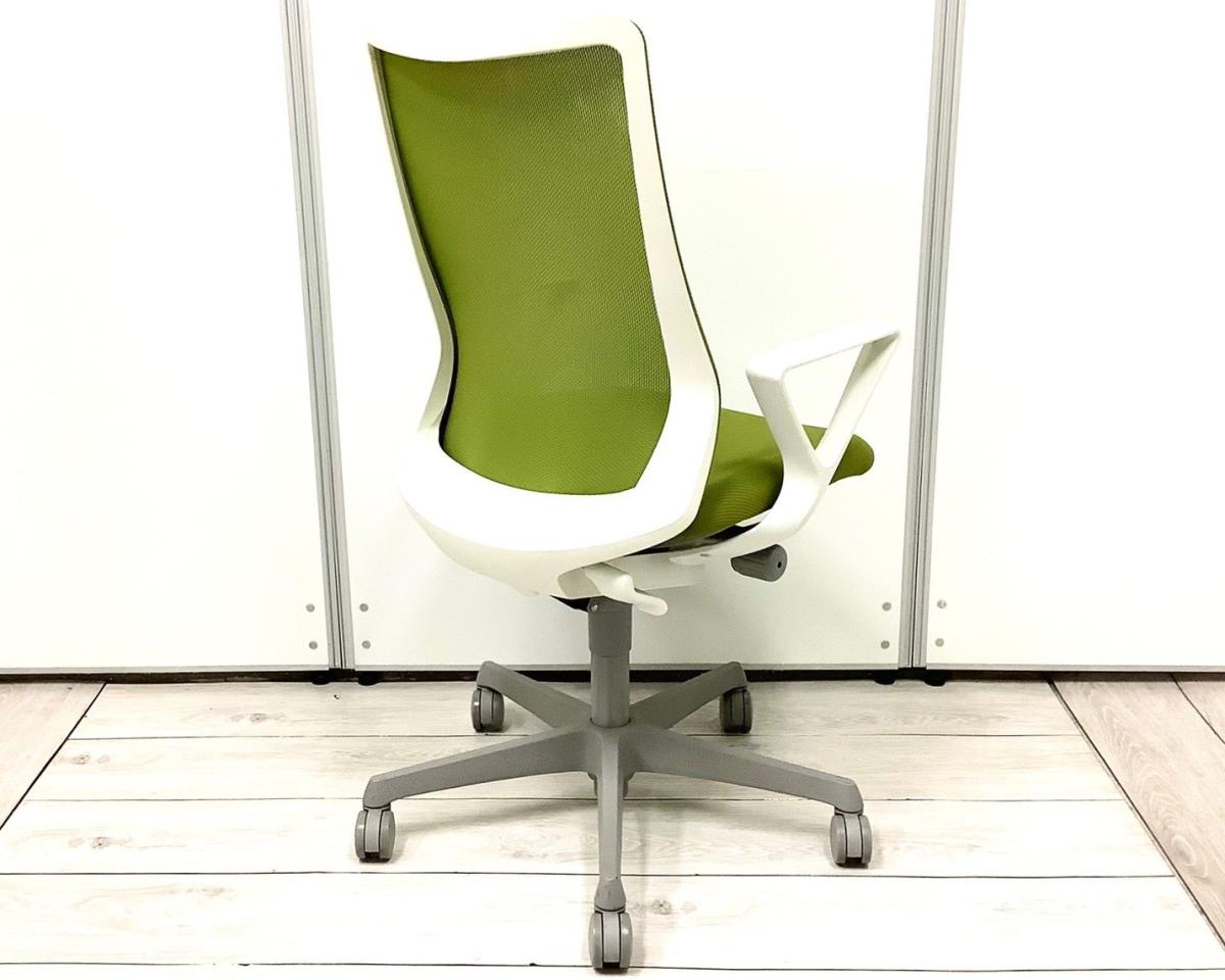 ★オカムラ製 フルーエント グリーン ホワイトフレーム 肘付き ハイバック 背面メッシュ デザインアーム※固定肘 腰まわりをしっかりホールド! 長時間作業も快適フィット! 肘付きハイバックチェア!!