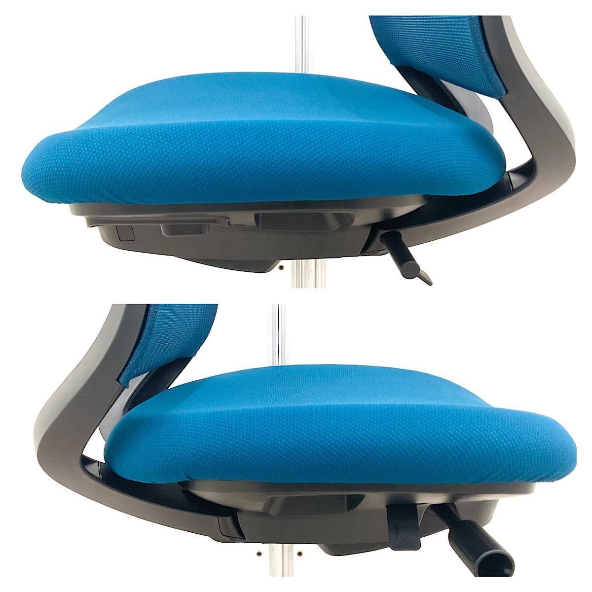 - 座面の高さは上下に90㎜、奥行は前後に50㎜調節可能。さらに骨盤を支えるポスチャーシート採用で着座時の前滑りを防ぎます。