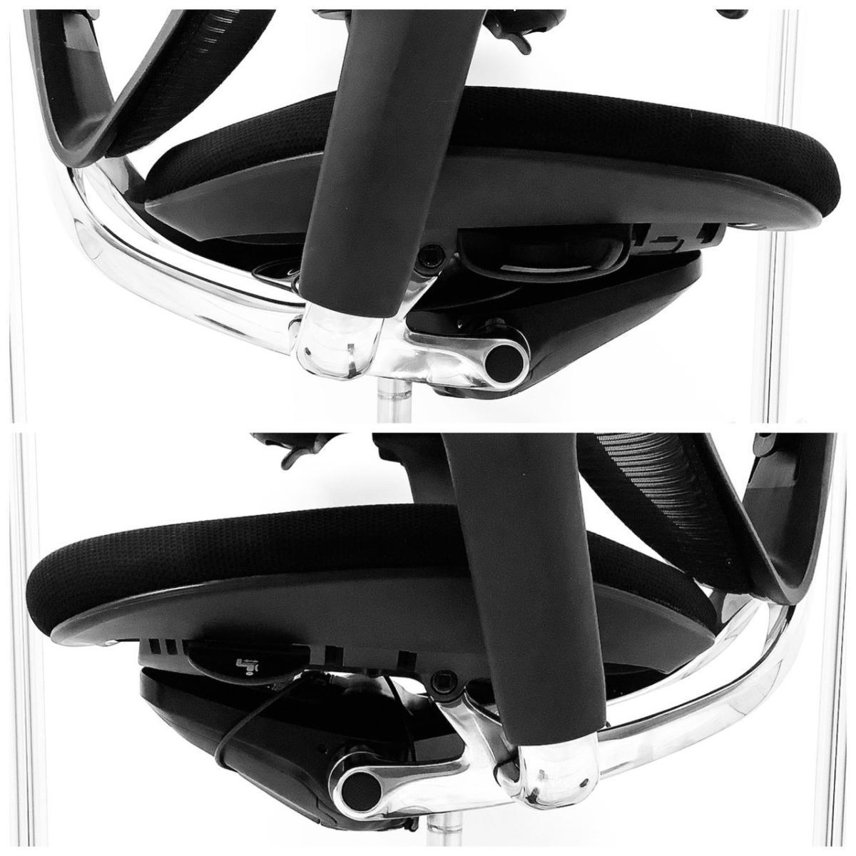 - 椅子と背が連動する「シンクロリクライニング」。リクライニング角度は直立ポジションから前方に10度、後方に23度です。