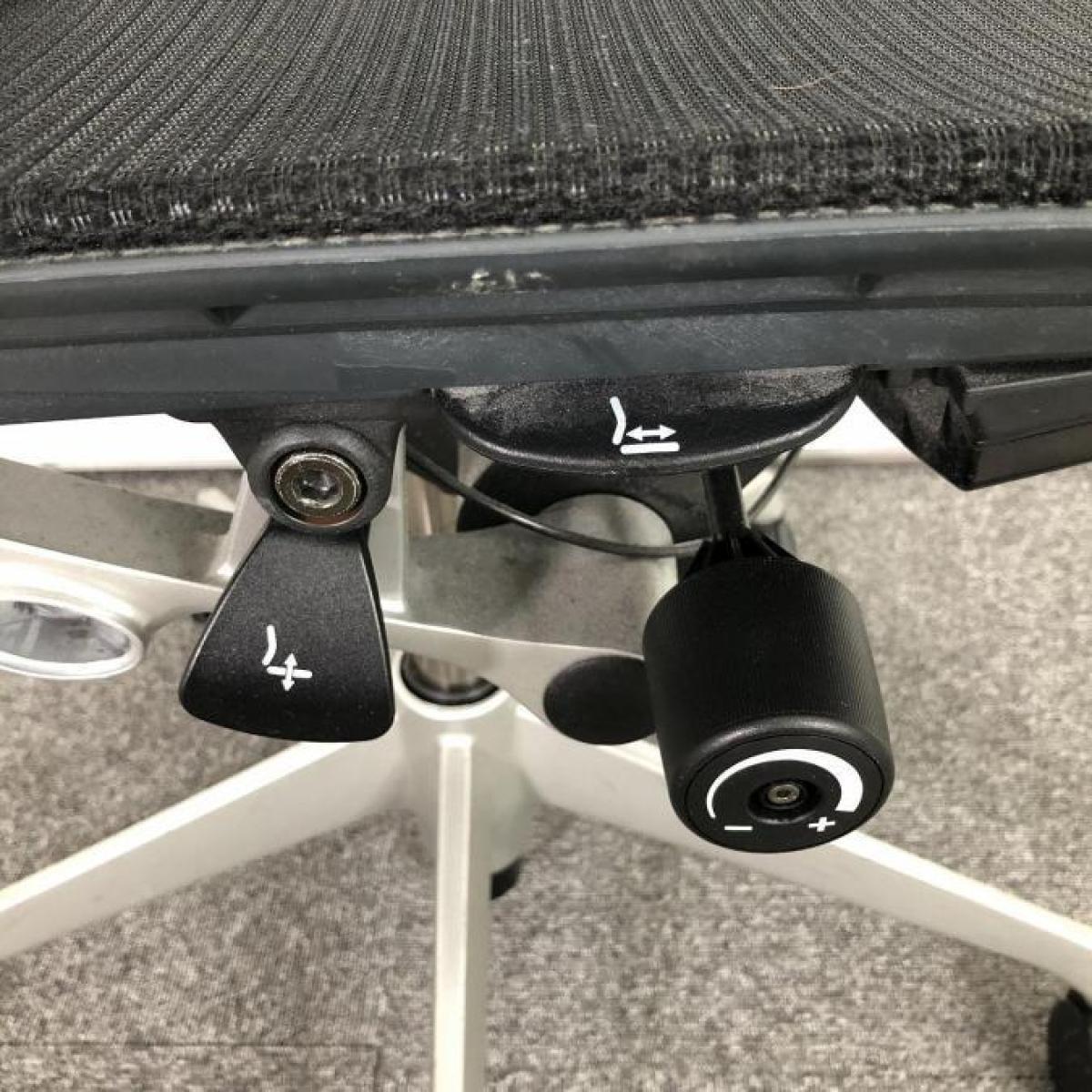 両手を自然に下ろした位置にあるレバーにて、座面の前後スライド調整(前後50mm)が可能です。