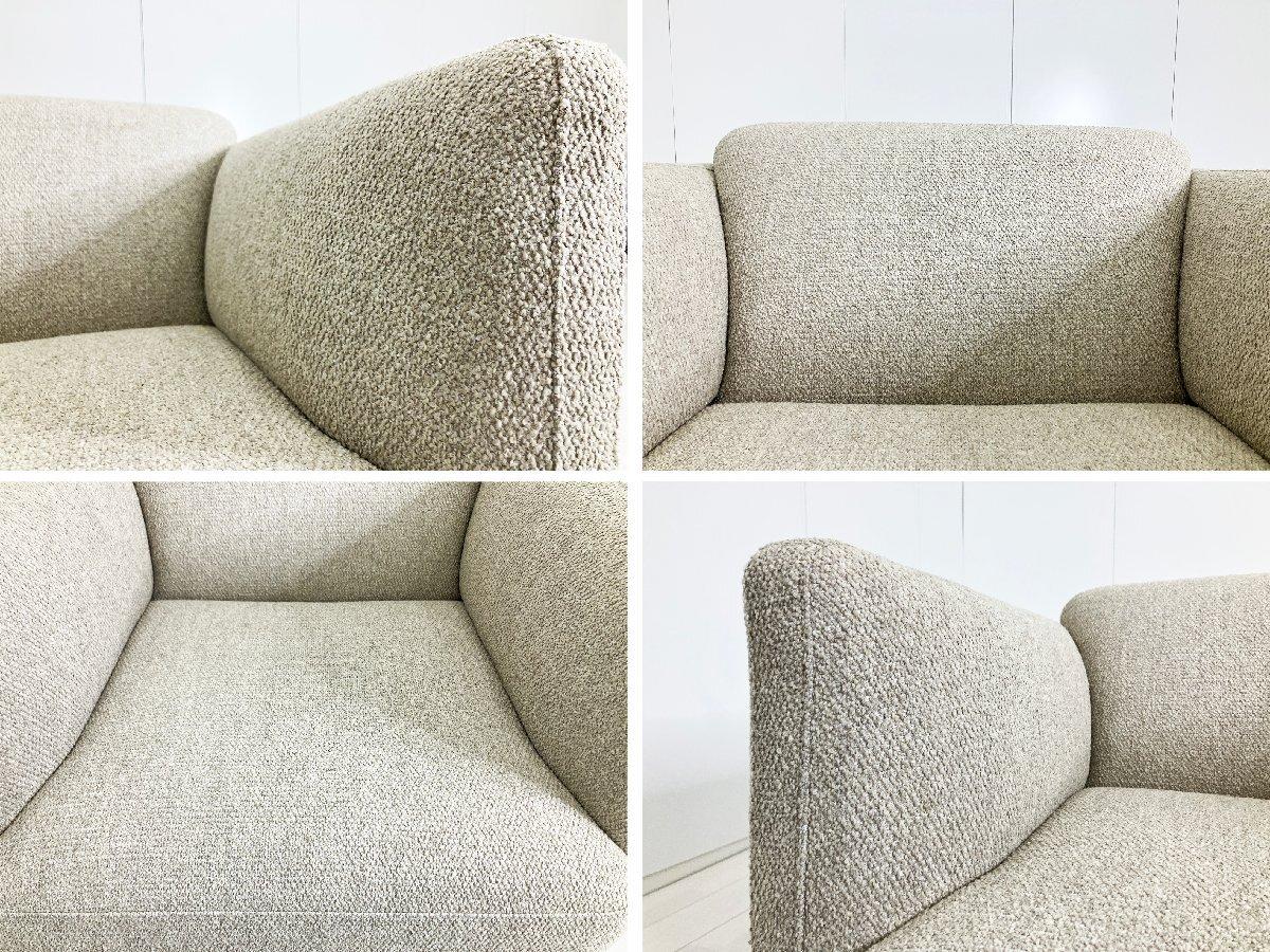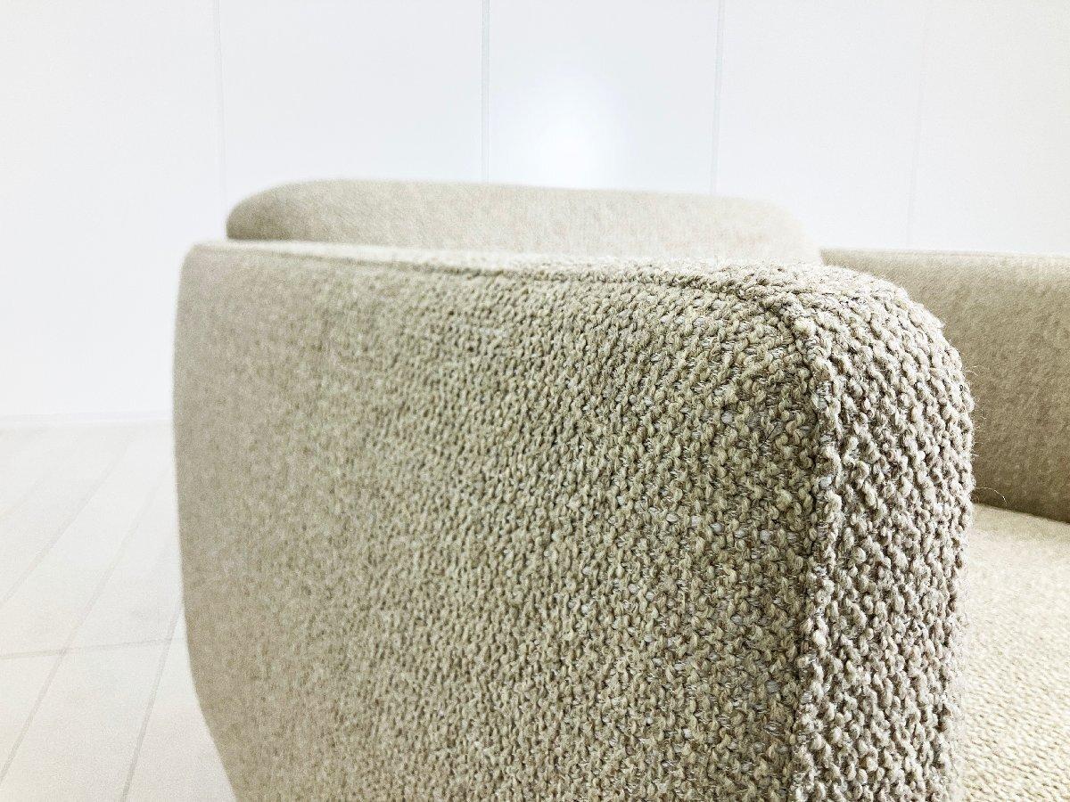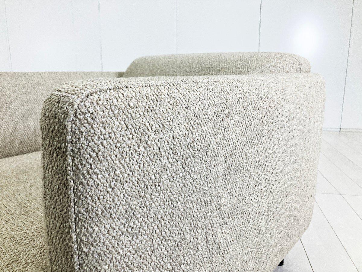 直線を基調としながらも、全体に程よい厚みと柔らかさを持たせたフォルムが印象的な一脚。座面と背、アームが一体となった構成により、コンパクトながらもしっかりと身体を支える安定感のある座り心地を実現しています。張地にはテクスチャー感のあるファブリックが用いられ、視覚的にも温かみのある表情です。