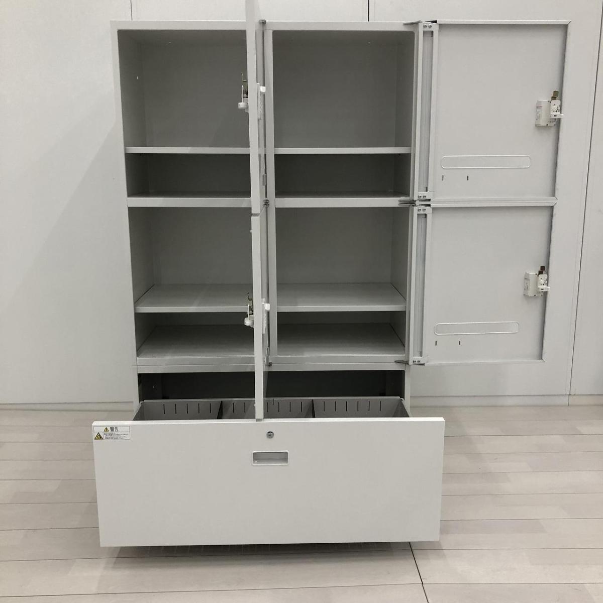 こちらは上段に4人用パーソナルロッカー、下段に引き出しタイプの書庫がついた仕様となっております。
