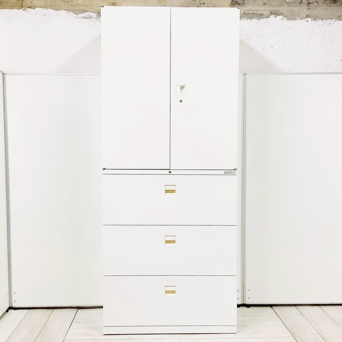 【定価約20万円】【オフィスの人気シリーズ!観音開き+引き出し仕様!書類整理におすすめ!】■オカムラ(okamura)製 SAデュオラインシリーズ 3S書庫セット 両開き+3段ラテラル H2150㎜ ■シリンダー錠 ■ホワイト