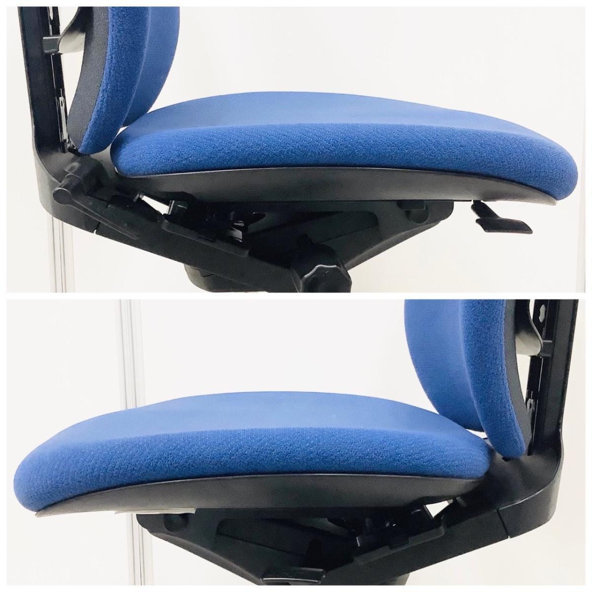 例えば、座面は、イトーキ独自の"ベンディングシート"という機構により、クッション、インターシェル、空洞という三層構造になっています。 この真ん中に挟まっているインナーシェルが、着座時の姿勢に合わせて体重を分散してくれるので、どんな姿勢でも体になじみ、疲労を軽減してくれます。 さらに、座面は前後に4センチほど奥行きを調整でき、前傾姿勢で座りたい、深く腰掛けたい、膝裏を圧迫されたくないなど、個人の好みに合った快適さにカスタマイズが可能となっています。