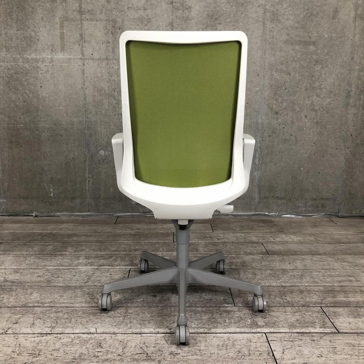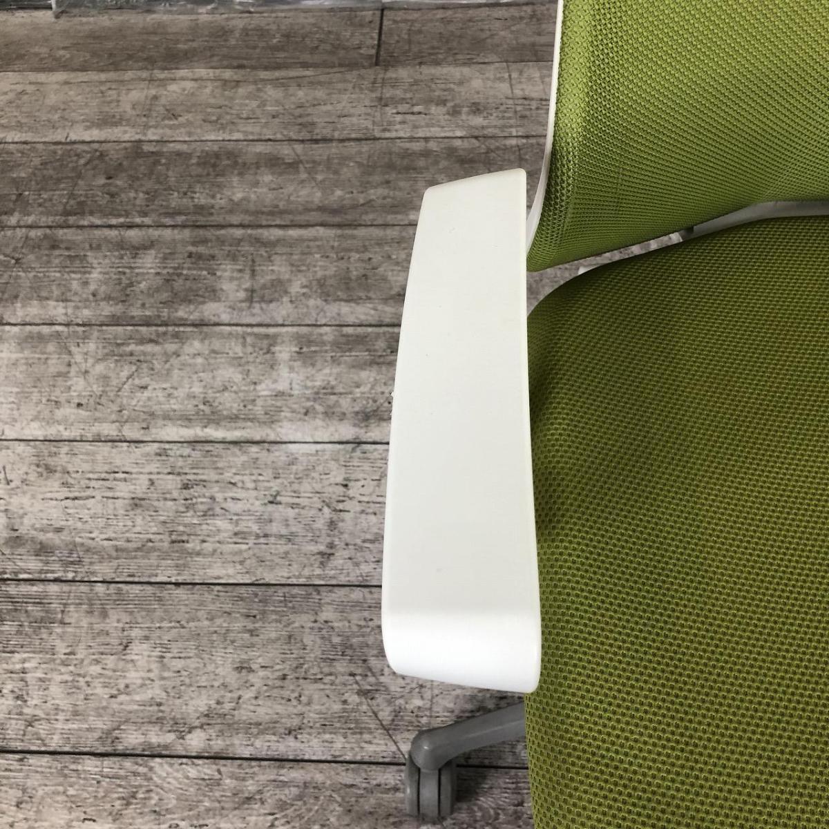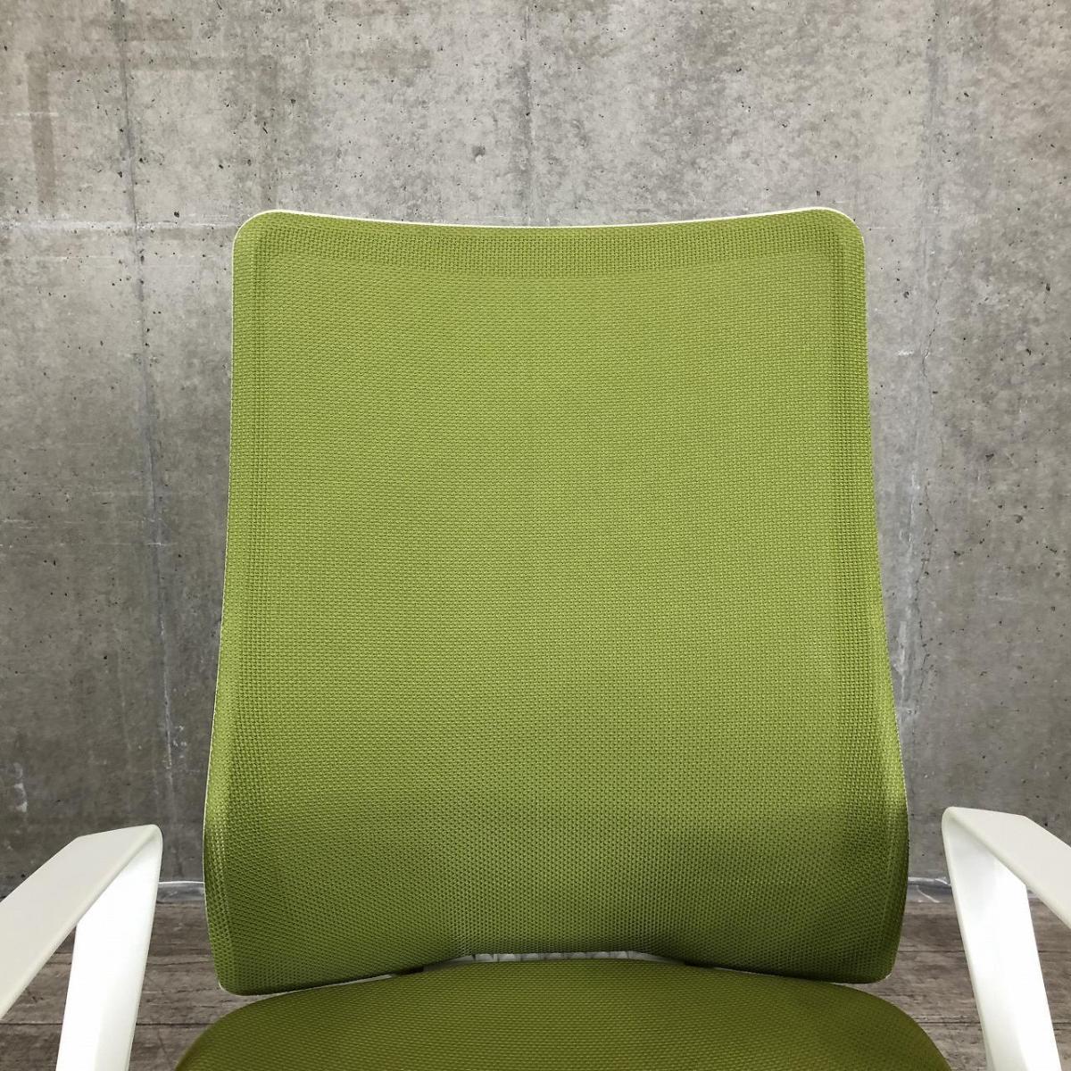 ★【T3】【商品入替のため、残り6脚限り】オカムラ製 フルーエント グリーン ホワイトフレーム 肘付き ハイバック 背面メッシュ デザインアーム※固定肘 腰まわりをしっかりホールド! 長時間作業も快適フィット! 肘付きハイバックチェア!!