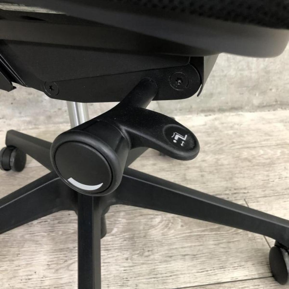 - 座面右下のダイヤル操作で、リクライニングの強弱調整が行えます。これまでのダイヤル式よりも、少ない回転数で、最弱?最強の調整が可能です。