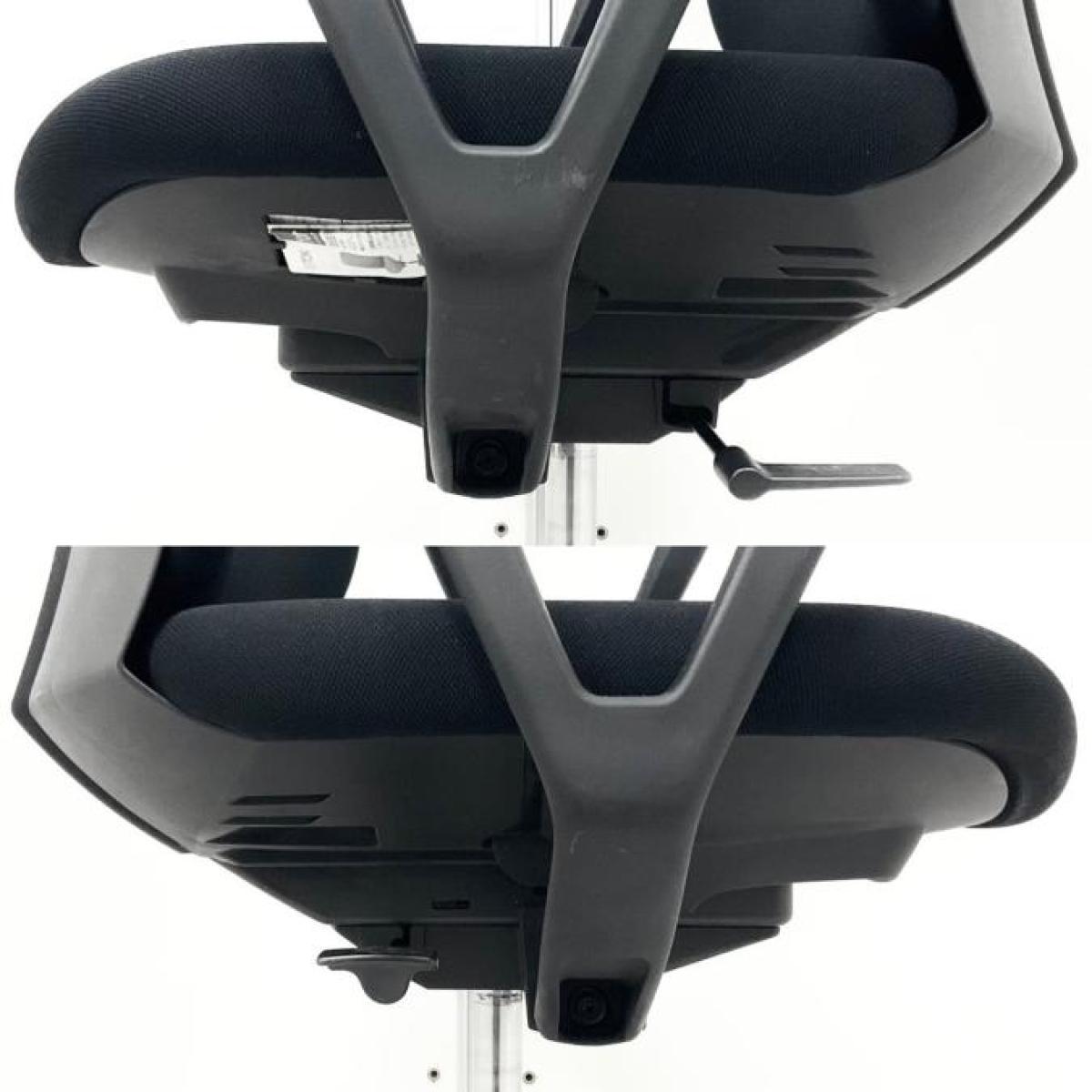 ロッキング時に、座面が前方にスライドするデュアルモーション機構が、後方への影響寸法を小さくし、通行に十分なスペースを確保