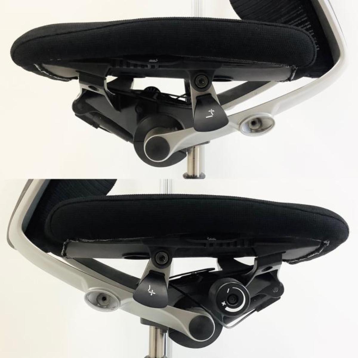 両手を自然に下ろした位置にあるレバーにて、座面の前後スライド調整(前後50mm)が可能です。