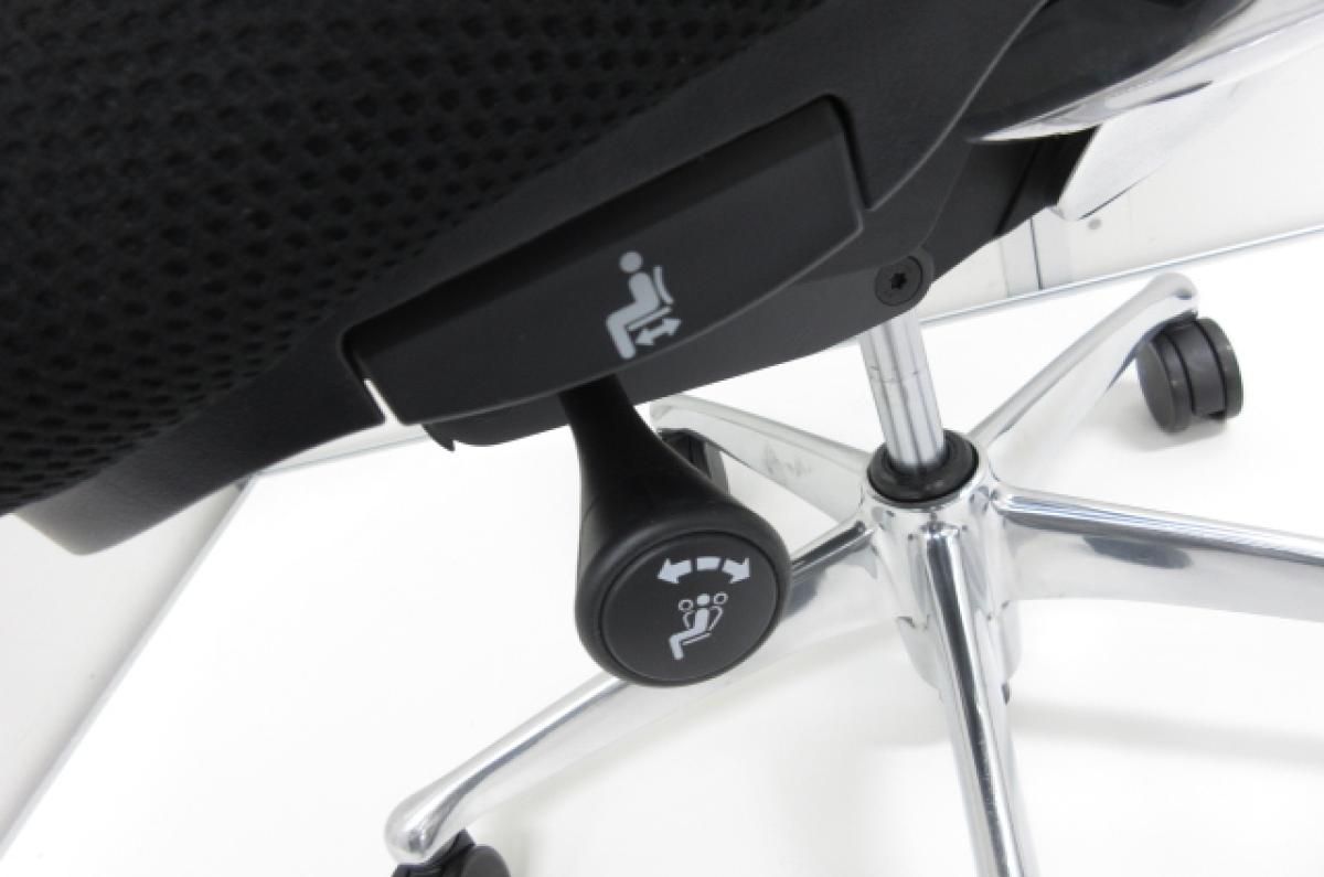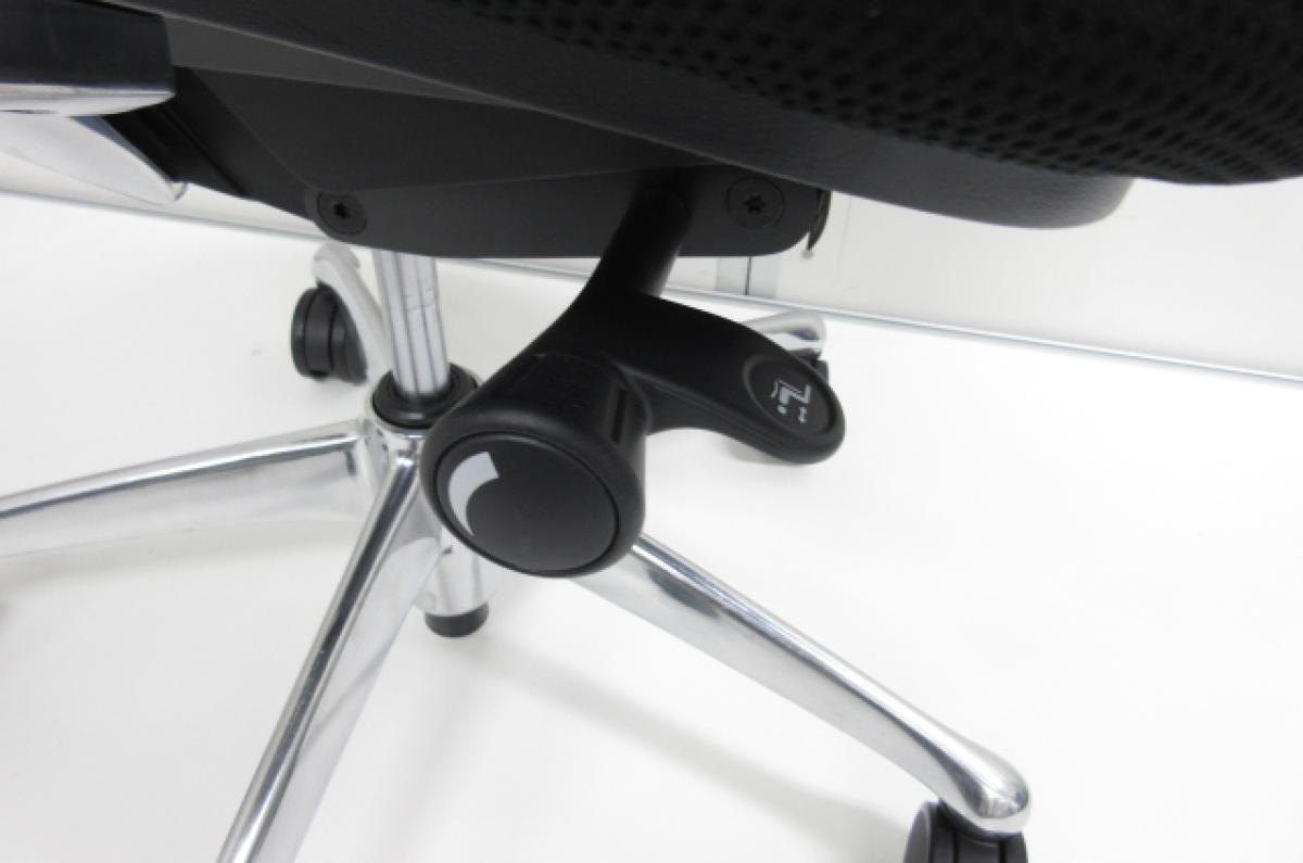 - 椅子と背が連動する「シンクロリクライニング」。リクライニング角度は直立ポジションから前方に10度、後方に23度です。