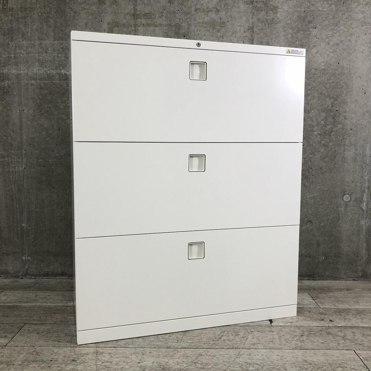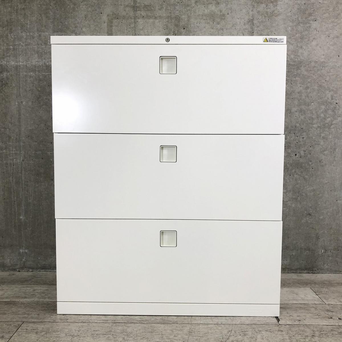 【定価約12万円】【ファイル収納にオススメ!高品質で使いやすい人気シリーズの3段ラテラル書庫!】■オカムラ(okamura)製 レクトラインシリーズ 3段ラテラル書庫 ローキャビネット H1100㎜ ■ホワイト ■シリンダー鍵※天板無