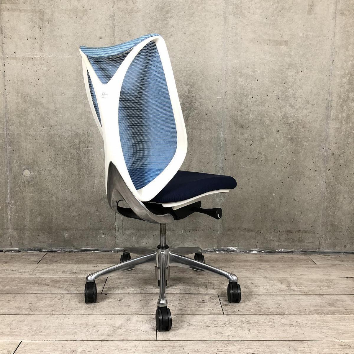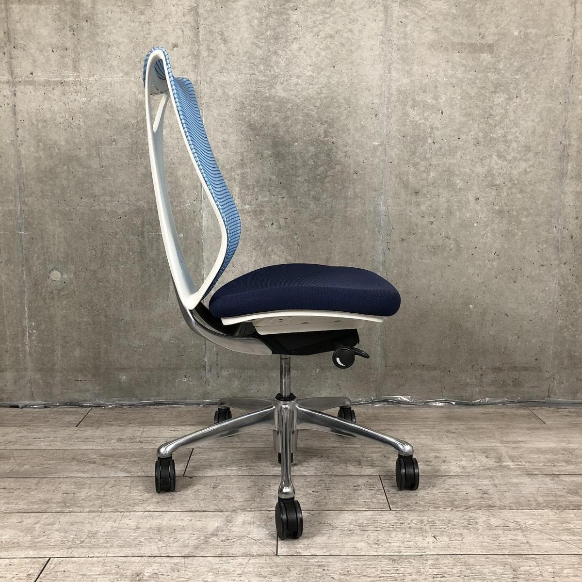 【T9】オカムラ製 サブリナシリーズ アクアブルー 背もたれ/アクアブルーx座面/ダークブルーのツートンカラー ホワイトフレーム 前傾チルト付 流れるような美しいフォルムの最高級メッシュチェア! 肘無しハイバックチェア!!