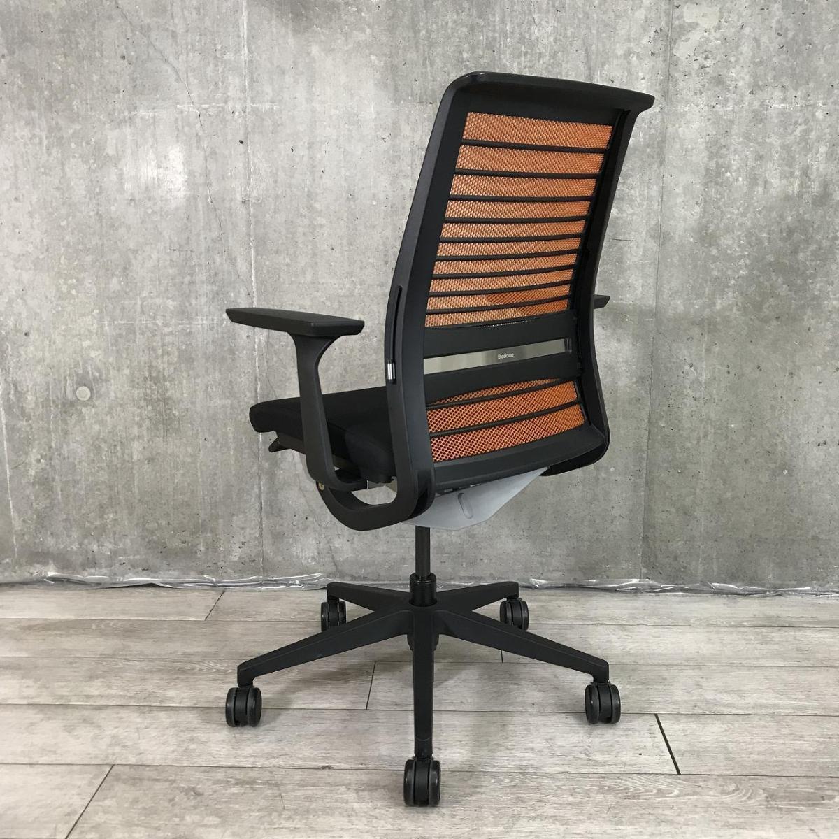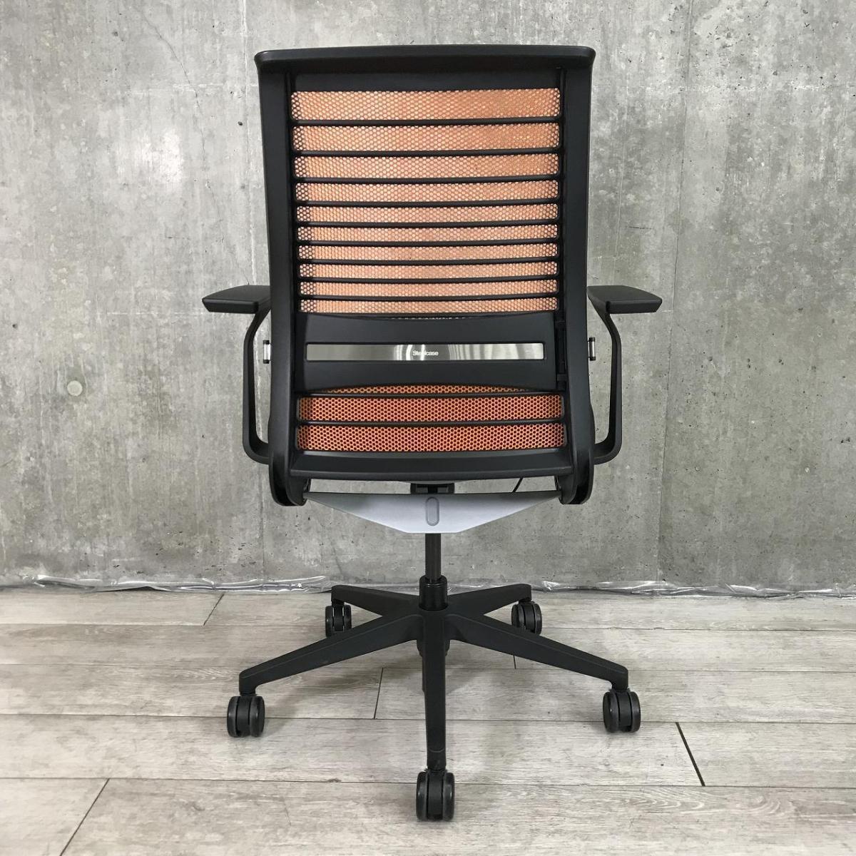 【定価約16万円】【ワイヤーが体にフィットするアメリカ発の大人気商品!長時間の着座ストレスを軽減!】 ■スチールケース(Steelcase)製 シンク(think)チェア 肘付き ハイバック ■メッシュバック ■固定肘/ランバー付 ■背面:オレンジ/座面:ブラック【入替セールにつき20%OFF!】