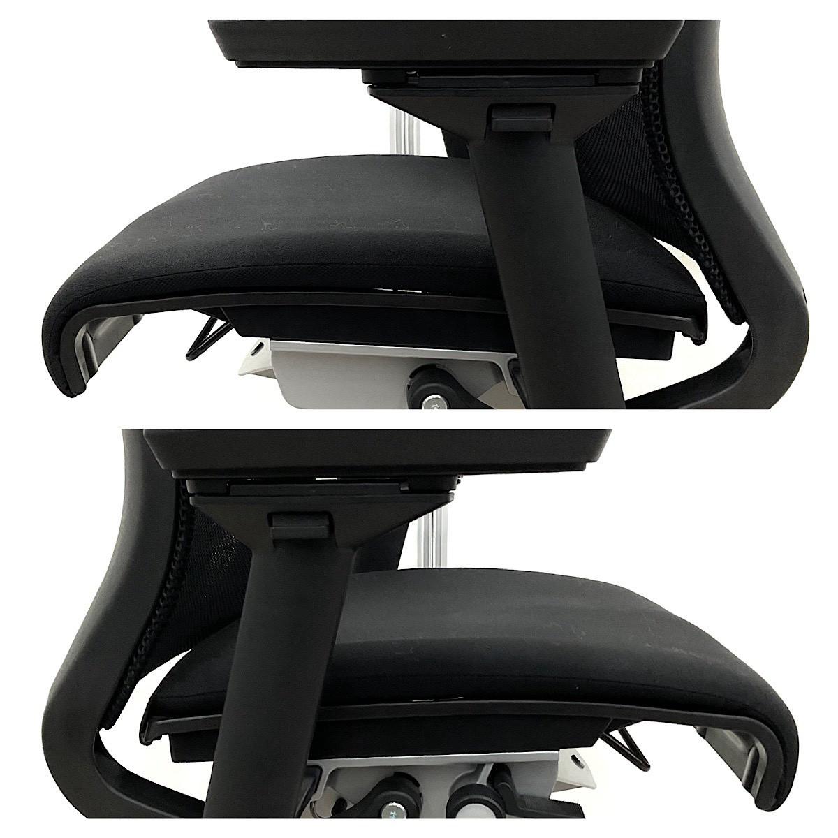 快適な座り心地に不可欠な調節機能である、上下昇降、座面の奥行き調整、リクライニングなどを備えており、操作もわかりやすく好評です。 特に、座面の奥行きは、座面下の左右に通った細いバーで調整でき、座ったままで軽やかに滑るように調整が可能です。 価格面では、新品では高めですが、中古は流通も多く、定価の3割前後の価格で高級チェアの座り心地を手に入れることができます!