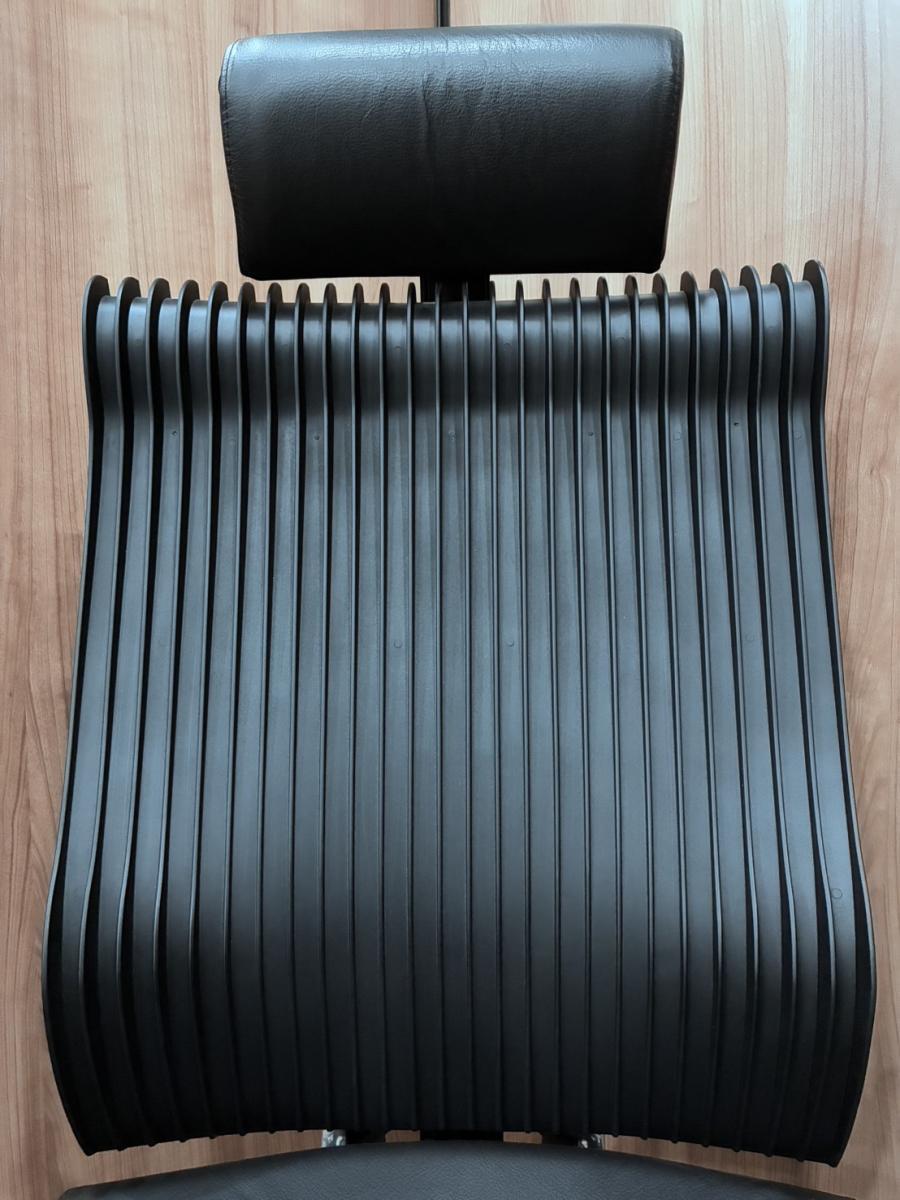 見た目は少し硬そうに見えるエラストマー素材ですが、座ってみると程よいしなり具合のやわらかな座り心地で、背中が痛くなるようなことはまるでありません。面ではなく線で支えることで、背面の通気性の良さは抜群です。