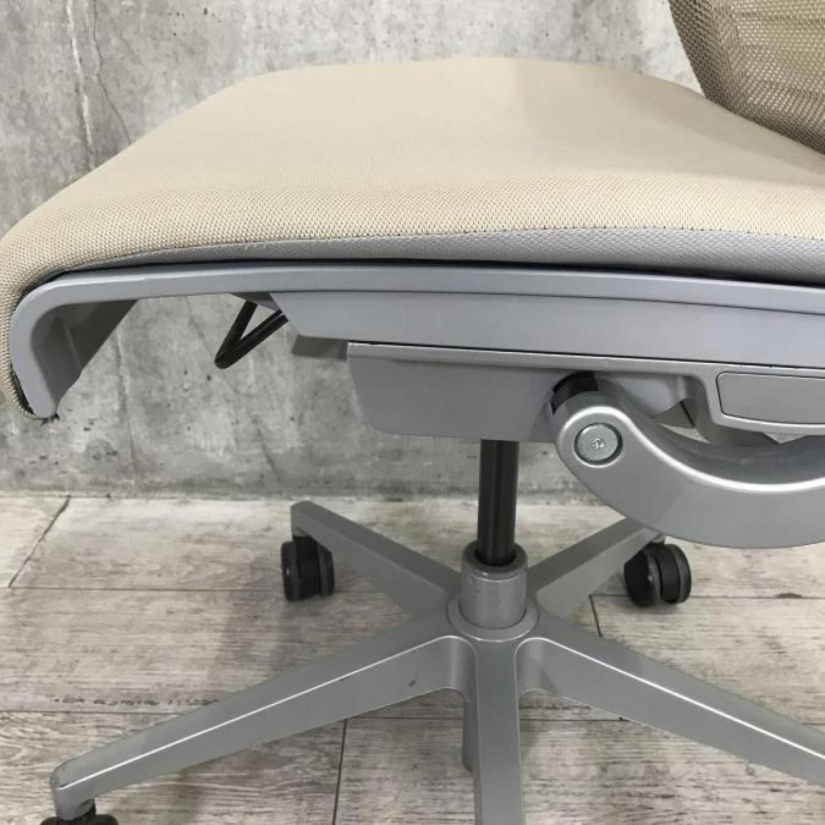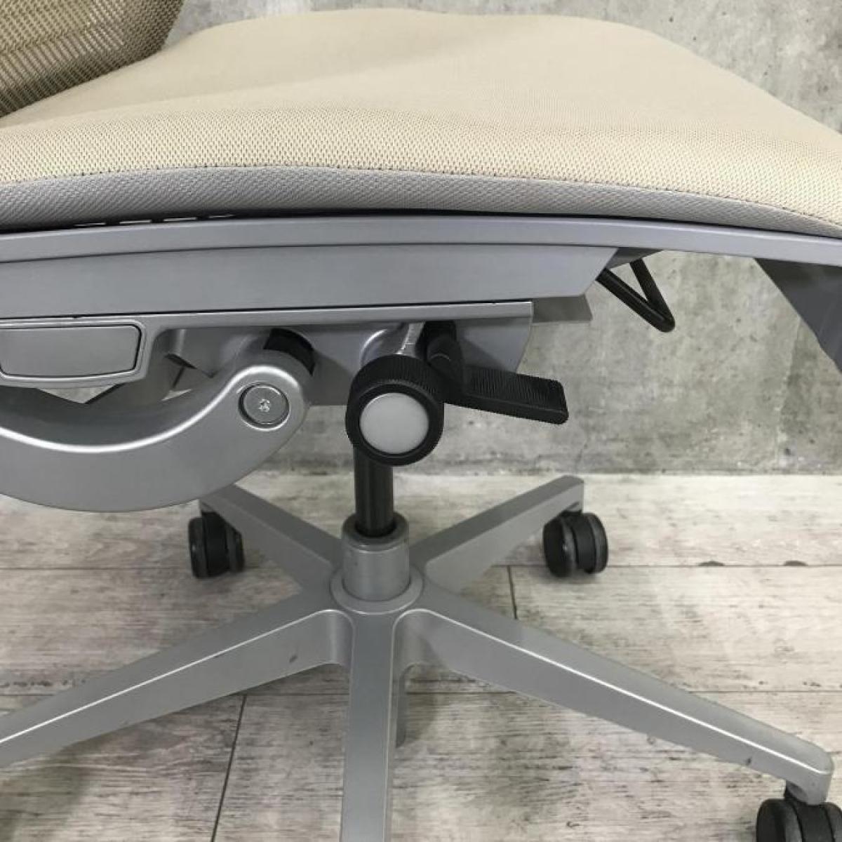 快適な座り心地に不可欠な調節機能である、上下昇降、座面の奥行き調整、リクライニングなどを備えており、操作もわかりやすく好評です。 特に、座面の奥行きは、座面下の左右に通った細いバーで調整でき、座ったままで軽やかに滑るように調整が可能です。 価格面では、新品では高めですが、中古は流通も多く、定価の3割前後の価格で高級チェアの座り心地を手に入れることができます!