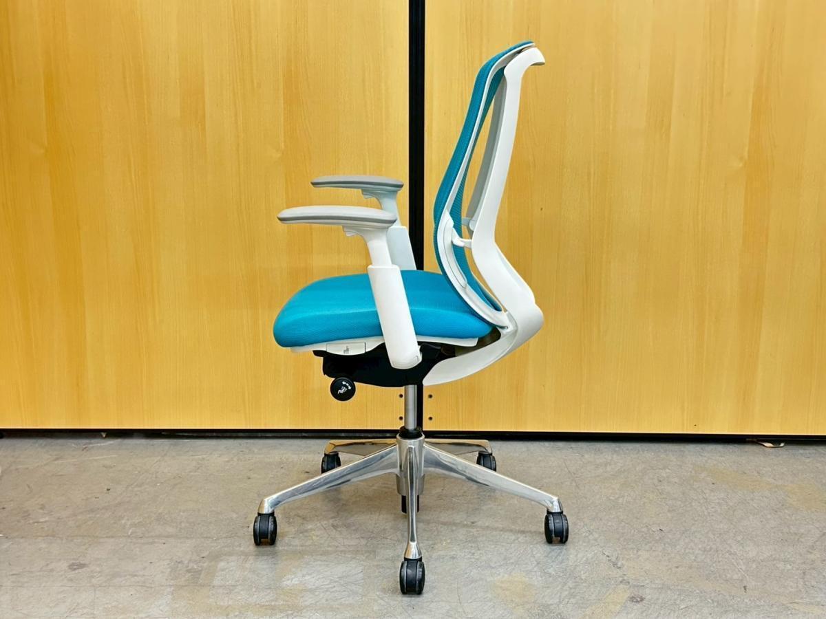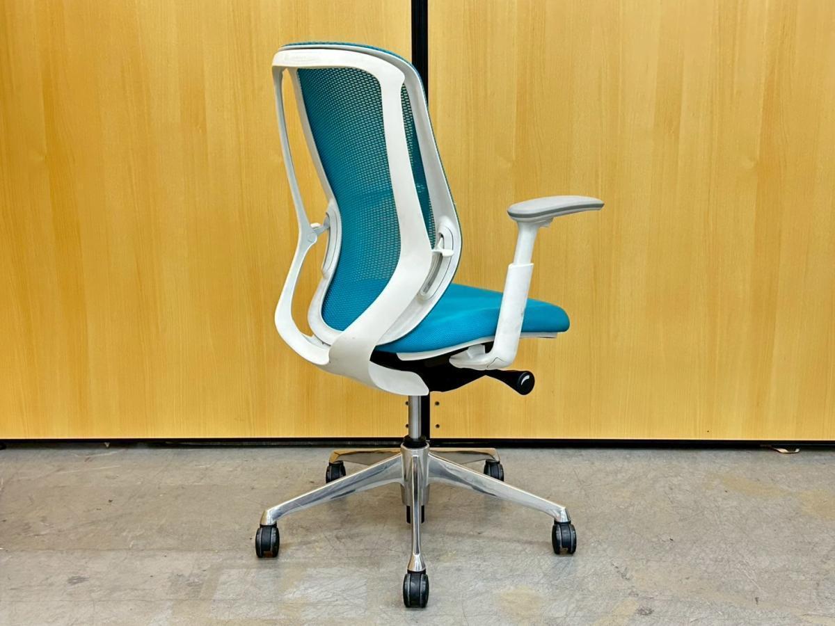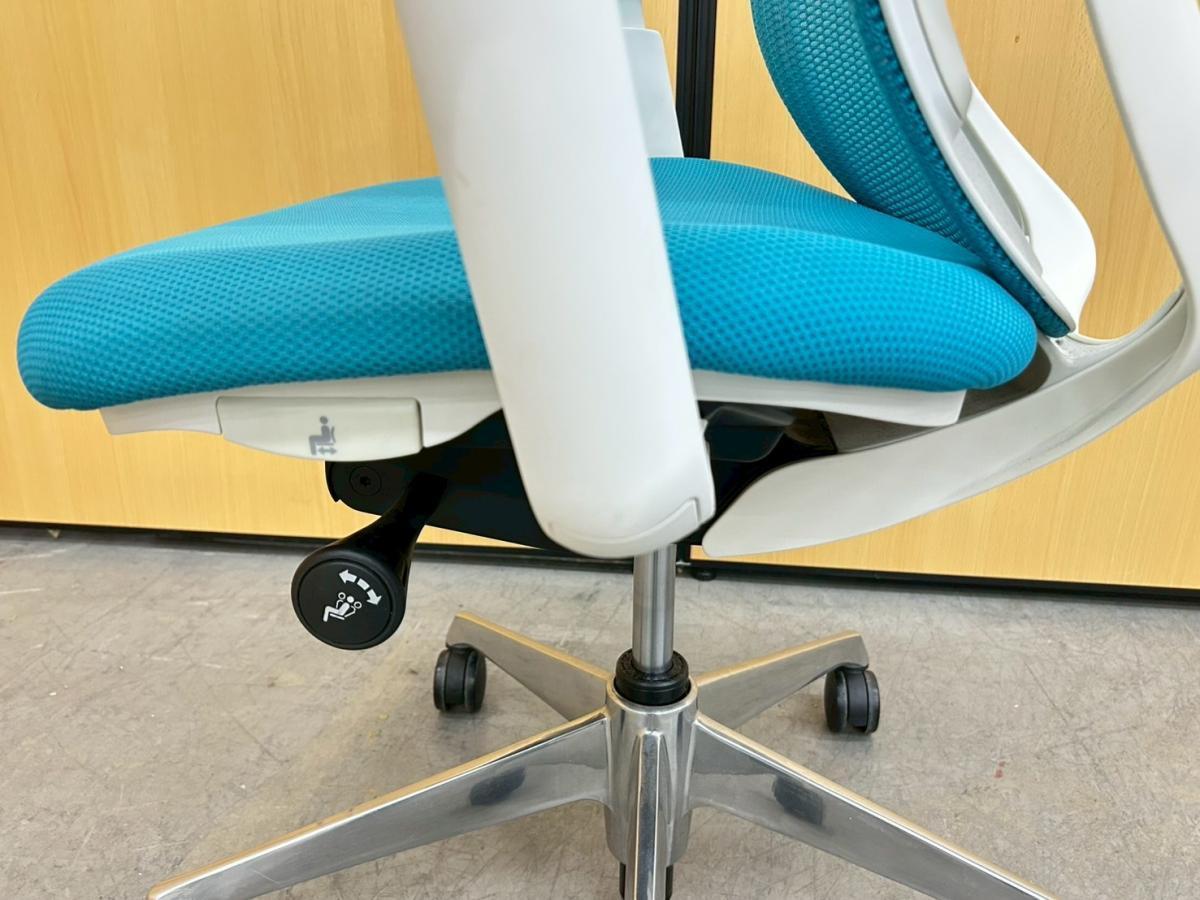 【訳あり品】座面スライドレバーに割れがあり、座面スライド不可。オカムラ シルフィー ハイバック デザインアーム(固定肘) ブルーグリーン×ホワイトフレーム 前傾機能付きの人気シリーズ 在宅ワークにも最適