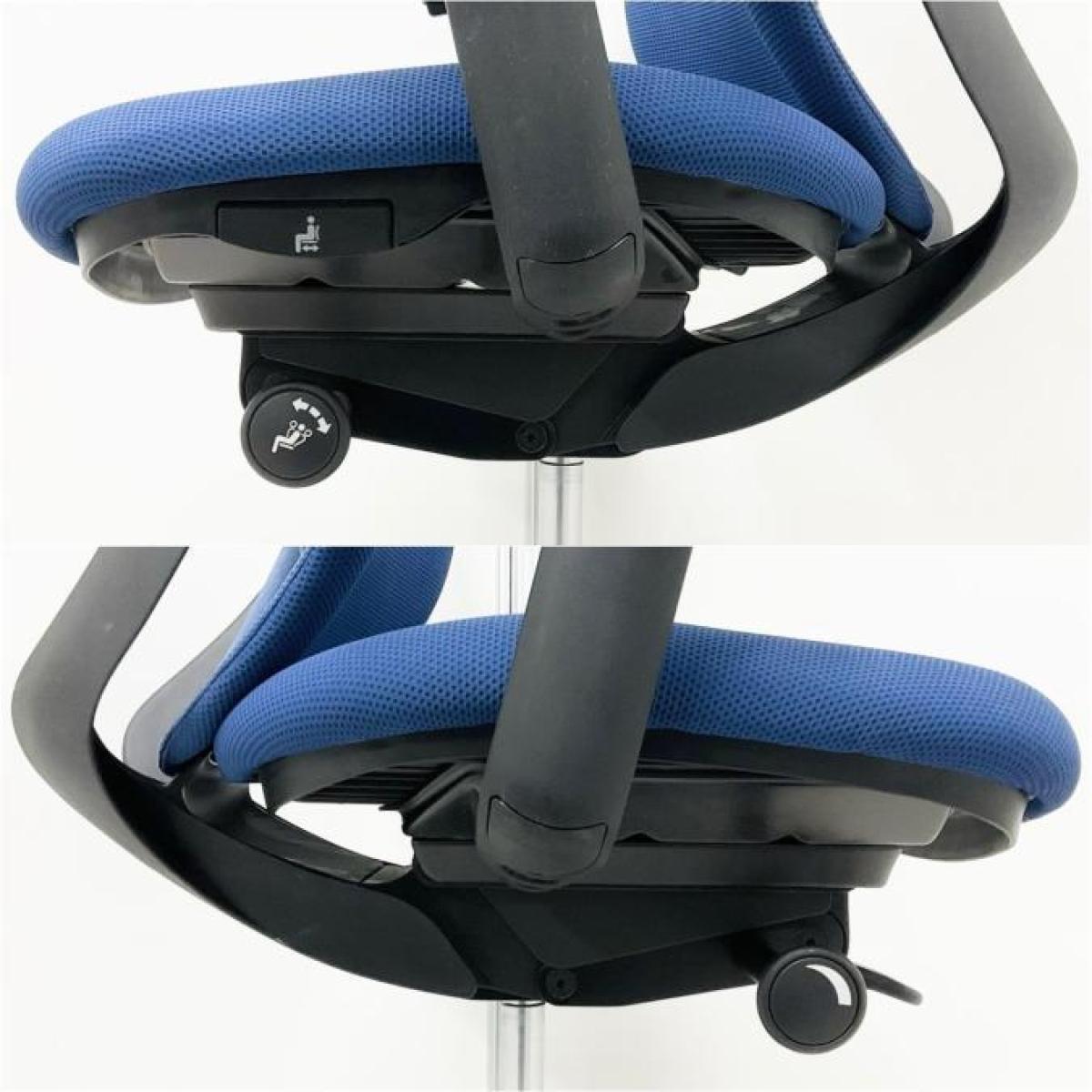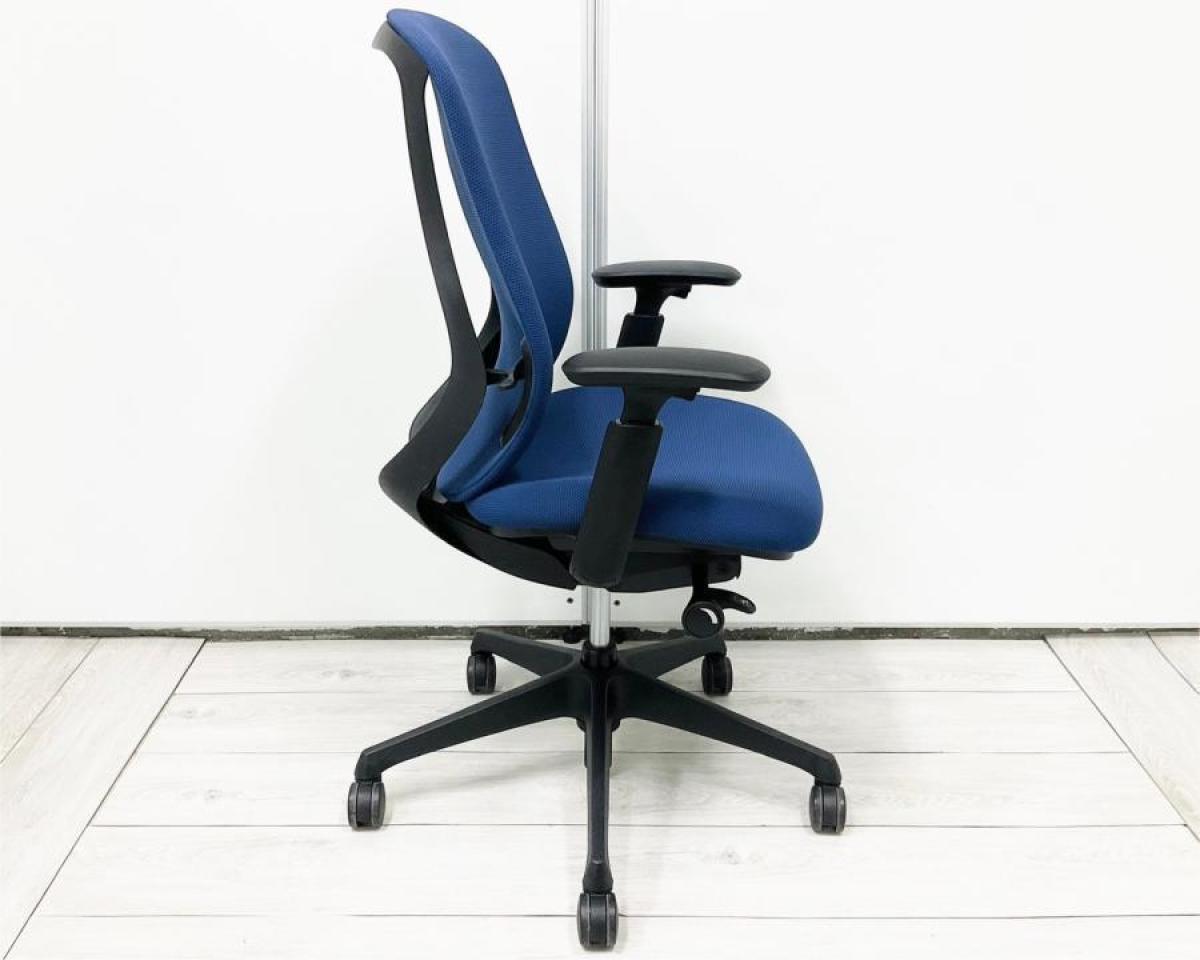 【いま売れています!背のカーブを変えられる新感覚のオフィスシーティング!】■オカムラ シルフィーチェア 可動肘付 ブルー ハンガー付 ※肘が擦れているためお安く!【A01056892】