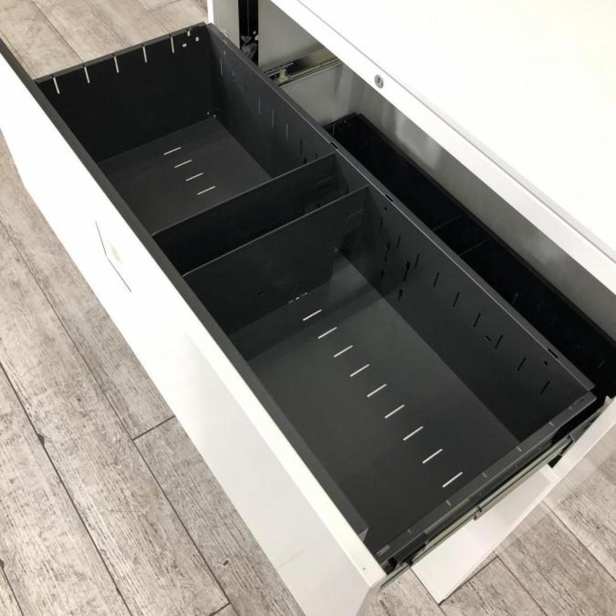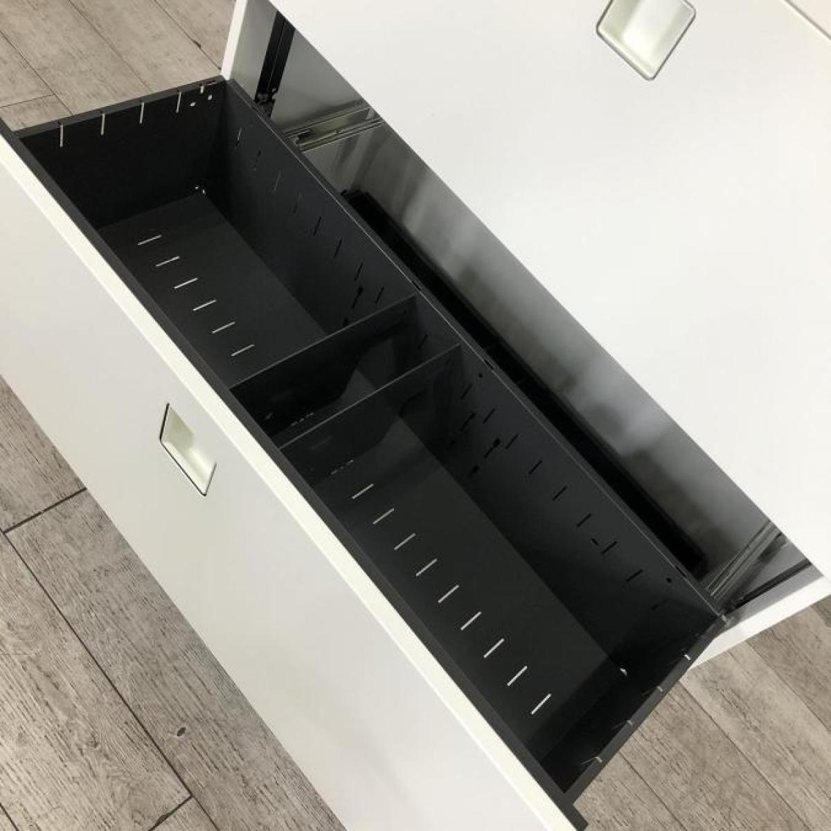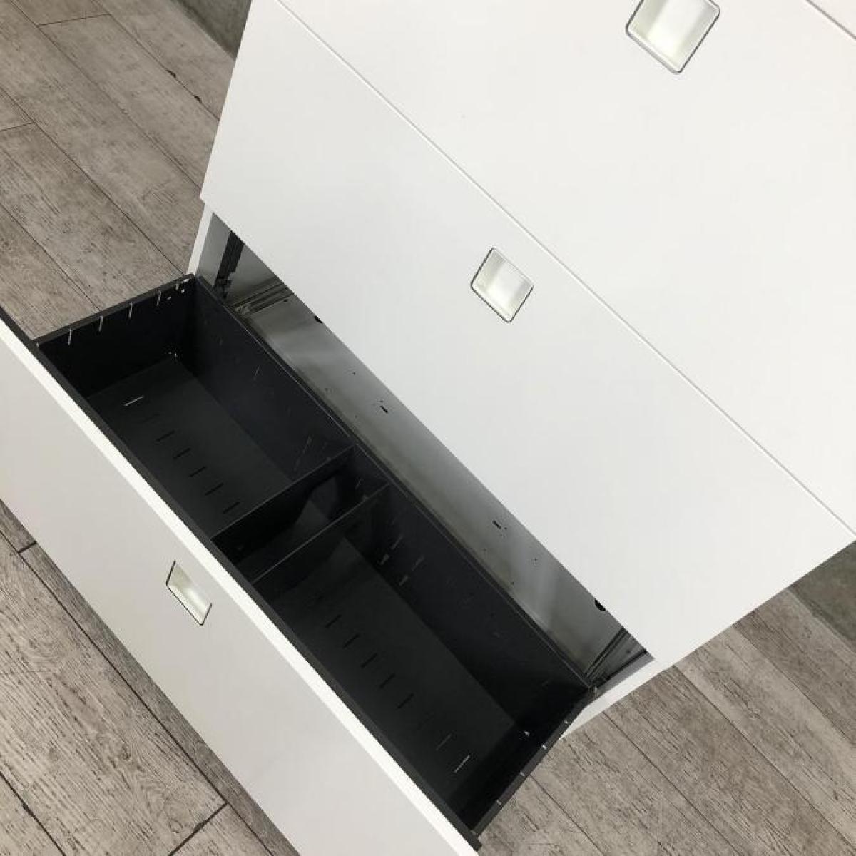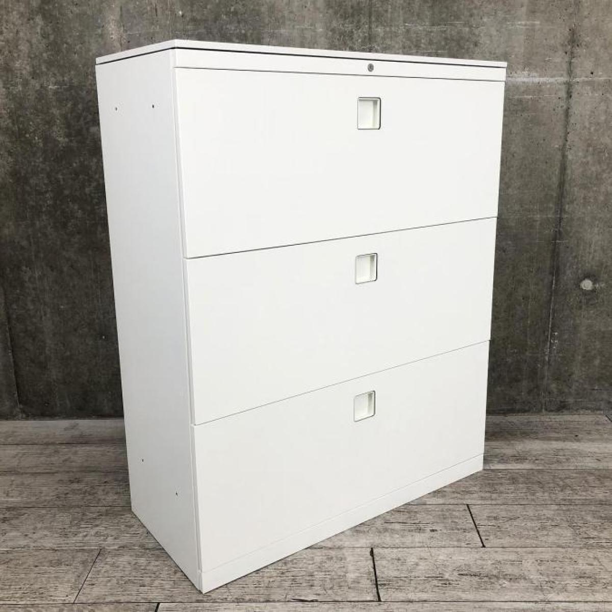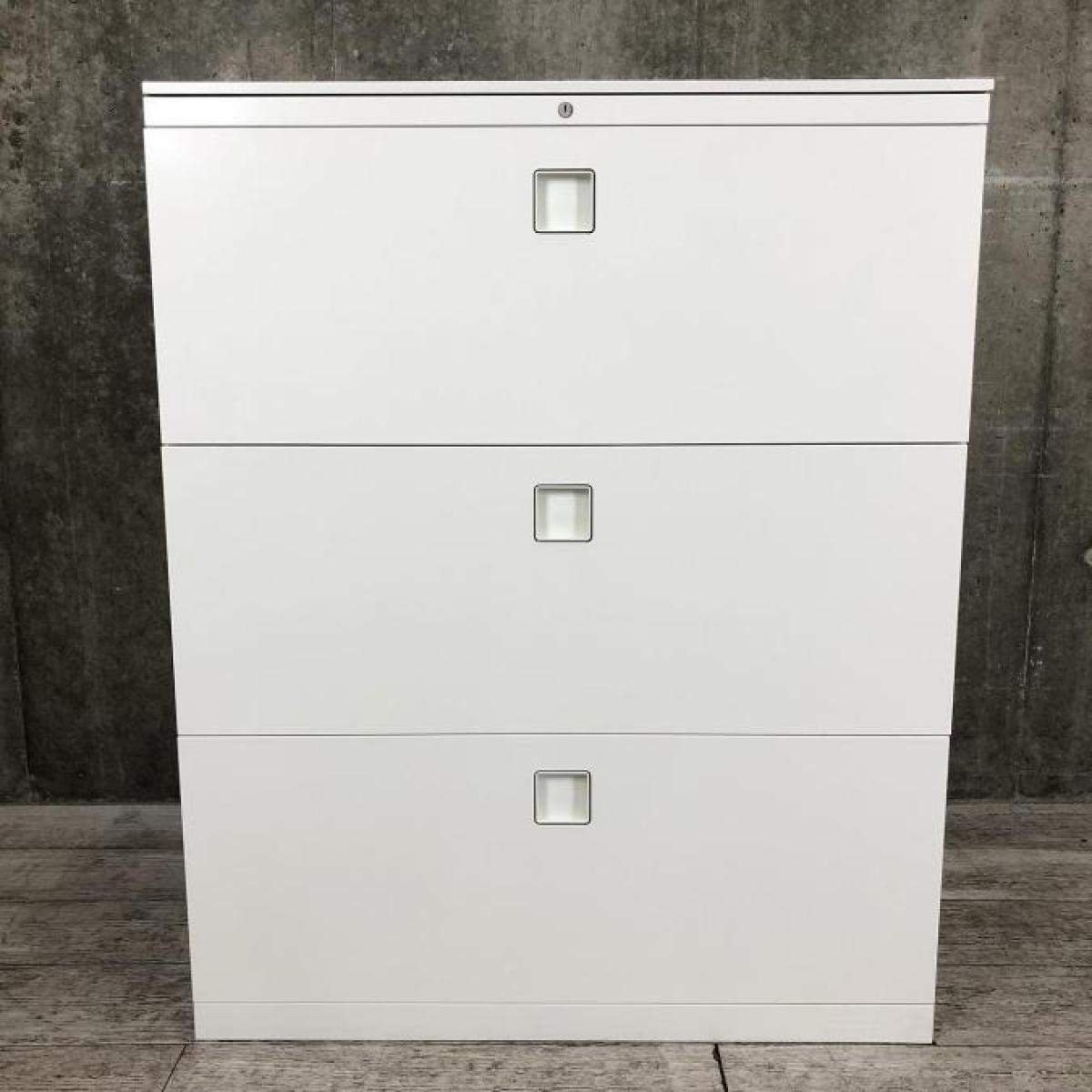 【オフィスの必需品!大容量の三段キャビネット】■オカムラ(okamura)製 レクトラインシリーズ 3段ラテラル書庫 ■シリンダー錠 ■ホワイト【天板付きなのでカウンターとしても使える!】