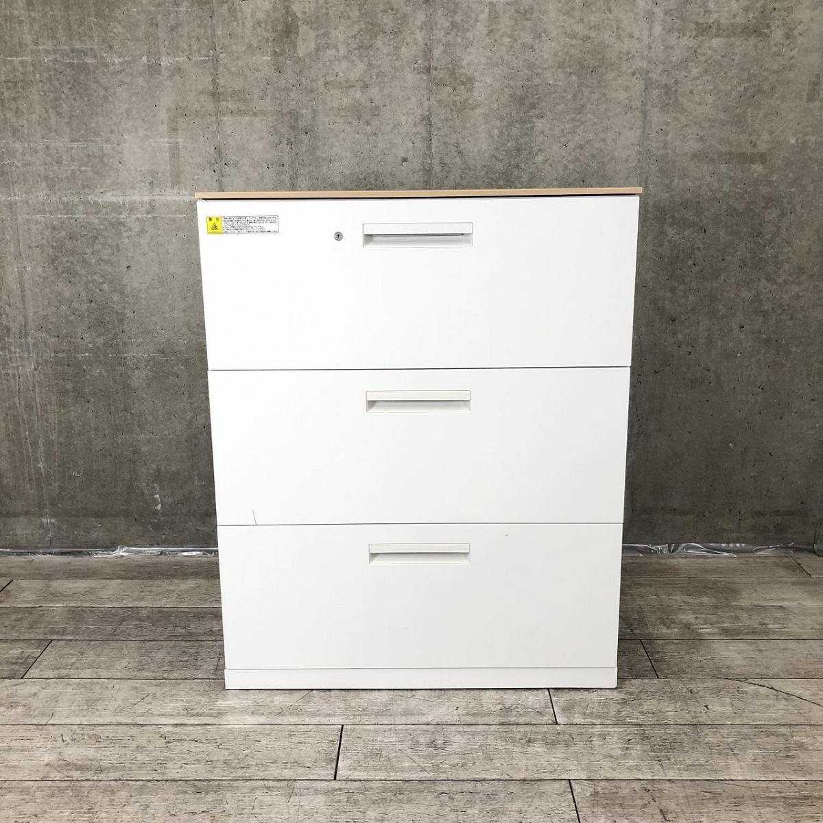 【書類を一気に収納!大型取っ手で開け閉めしやすい!】■ウチダ(UCHIDA)製 3段ラテラル HSシリーズ ■3段ラテラル書庫 ローキャビネット天板付 ■色:ホワイト/天板:ナチュラル ■シリンダー錠