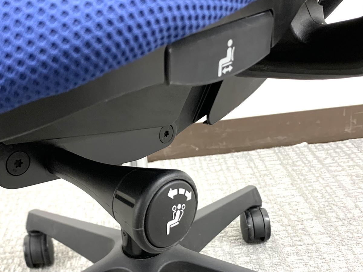 - 座面の左にあるレバー操作により、座面の奥行き調整が可能です。(ストローク:50mm)