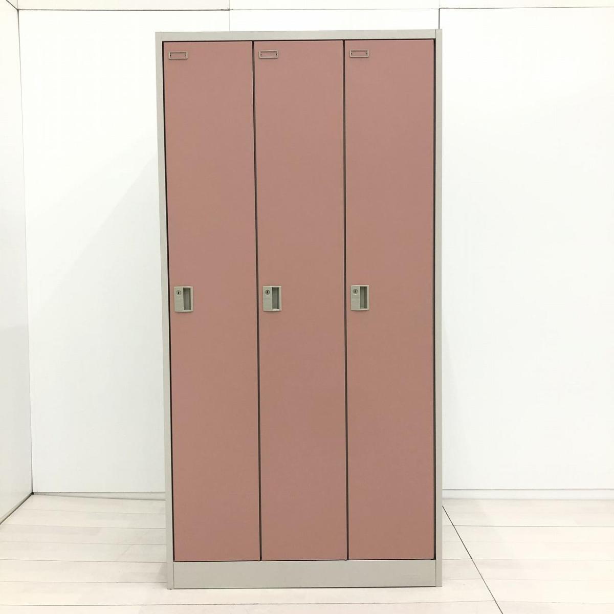 【衣類や貴重品の管理に便利な縦型3人用ロッカー!】■オカムラ(okamura)製 FZロッカー 3人用更衣ロッカー ■W900×D515×H1790mm ■シリンダー錠 ■ピンク- 足立・葛飾店