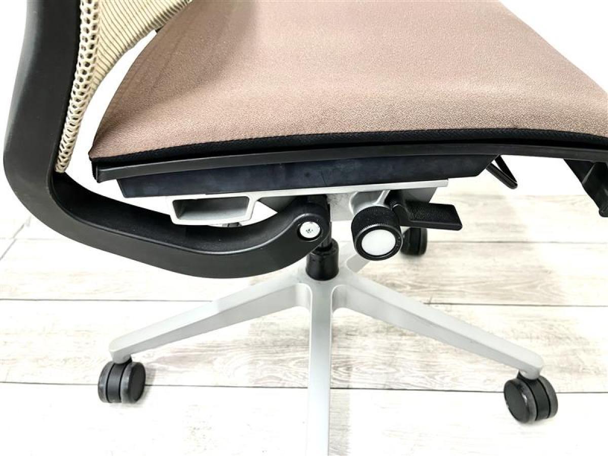 快適な座り心地に不可欠な調節機能である、上下昇降、座面の奥行き調整、リクライニングなどを備えており、操作もわかりやすく好評です。 特に、座面の奥行きは、座面下の左右に通った細いバーで調整でき、座ったままで軽やかに滑るように調整が可能です。 価格面では、新品では高めですが、中古は流通も多く、定価の3割前後の価格で高級チェアの座り心地を手に入れることができます!