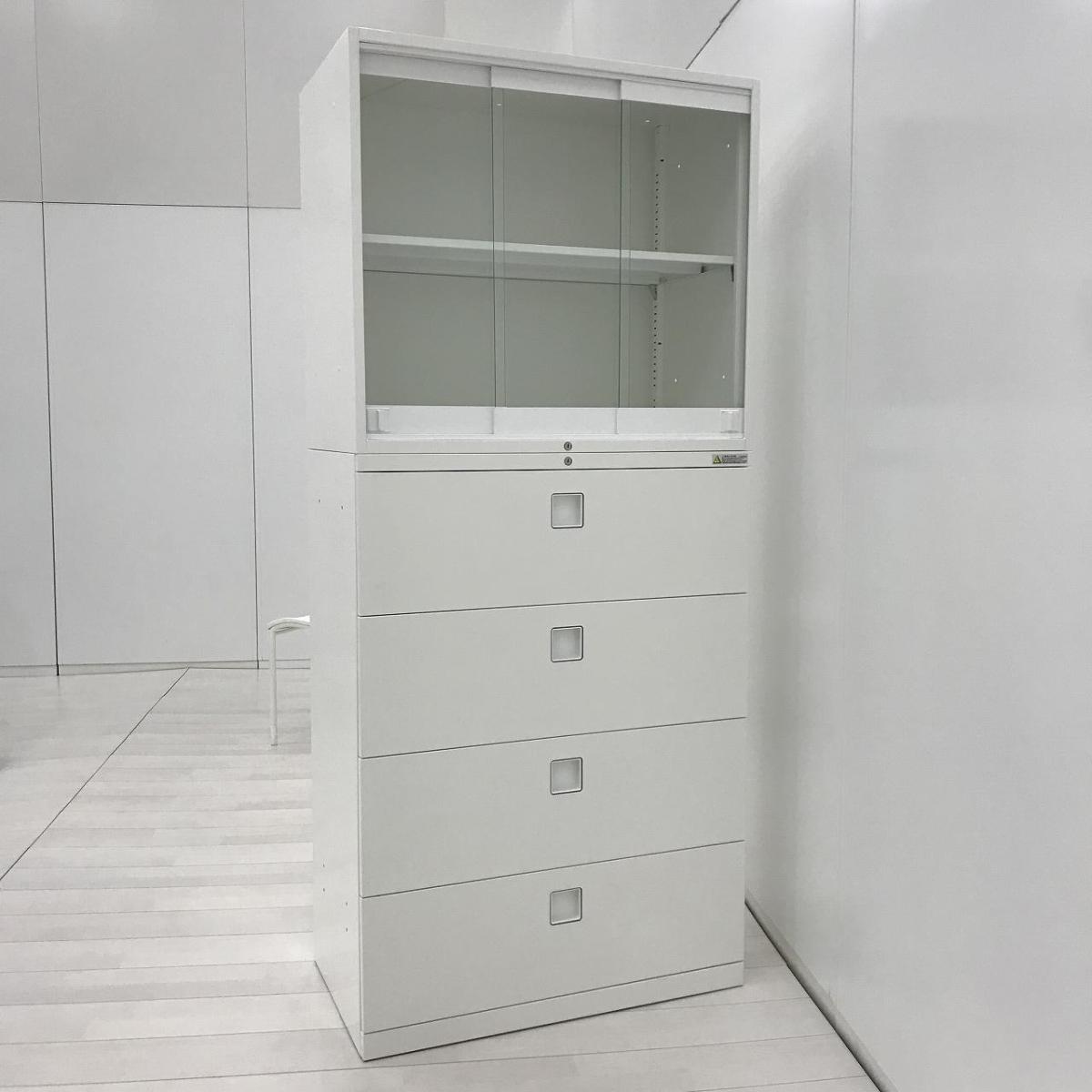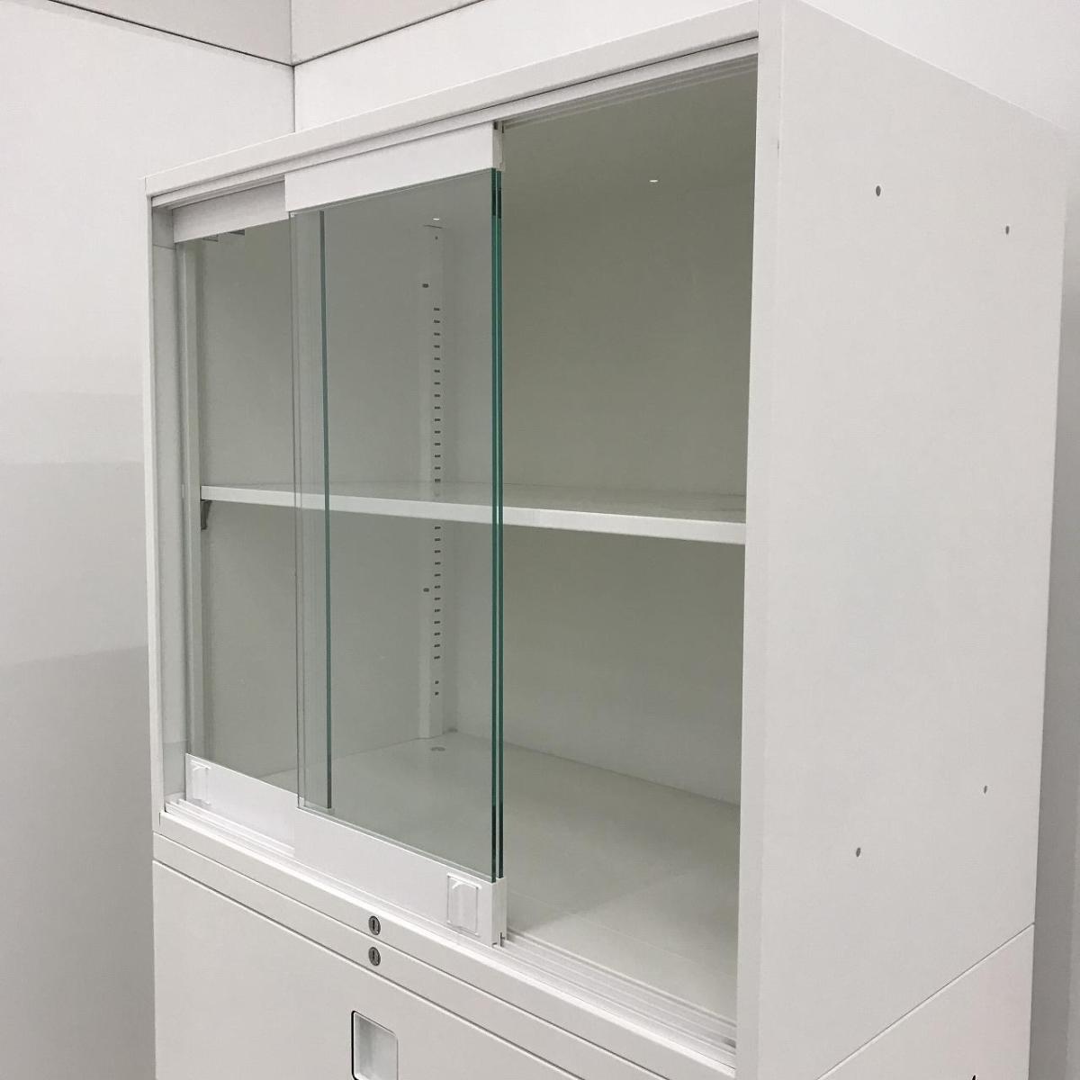 ★在庫限り!【中身が確認できる!人気のガラス書庫入荷!】■オカムラ レクトラインシリーズ ガラス3枚引き違い + 4段ラテラル書庫セット ホワイト ■W800mm!省スペースに大量収納!【上下書庫セット】- 川崎店
