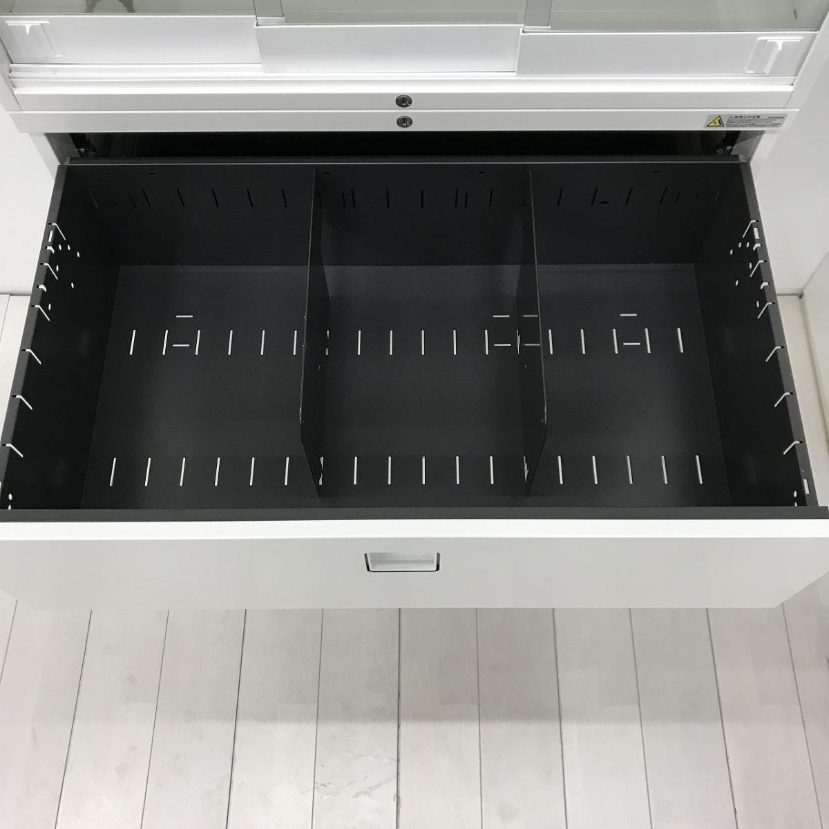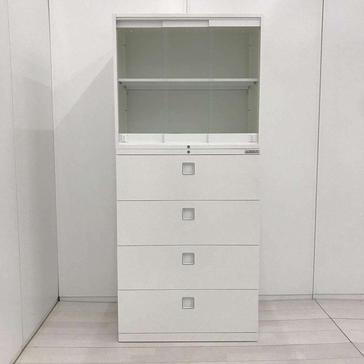 スライド式の扉+引き出しタイプの便利な書庫セットが入荷!使い勝手抜群のハイキャビネットが入荷! ■オカムラ/レクトライン/ホワイト 3枚引き戸+3段ラテラルキャビネット