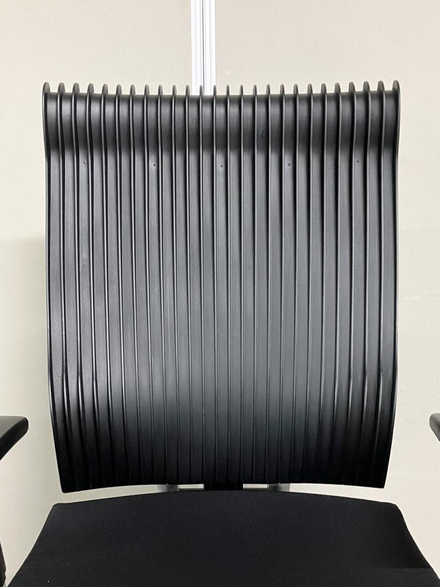 見た目は少し硬そうに見えるエラストマー素材ですが、座ってみると程よいしなり具合のやわらかな座り心地で、背中が痛くなるようなことはまるでありません。面ではなく線で支えることで、背面の通気性の良さは抜群です。
