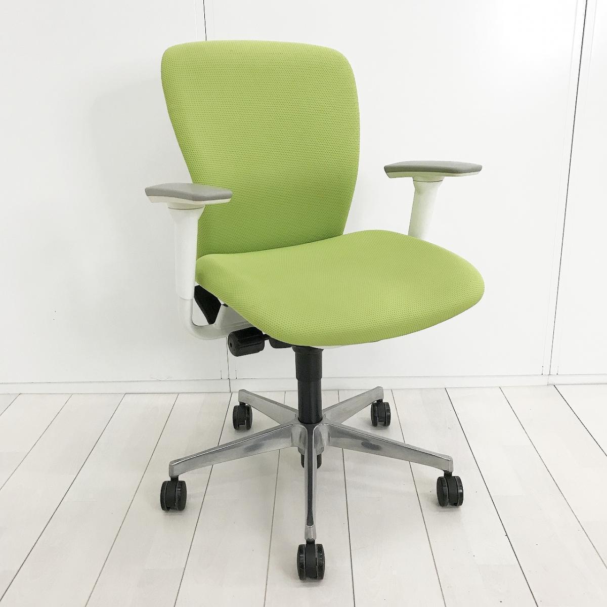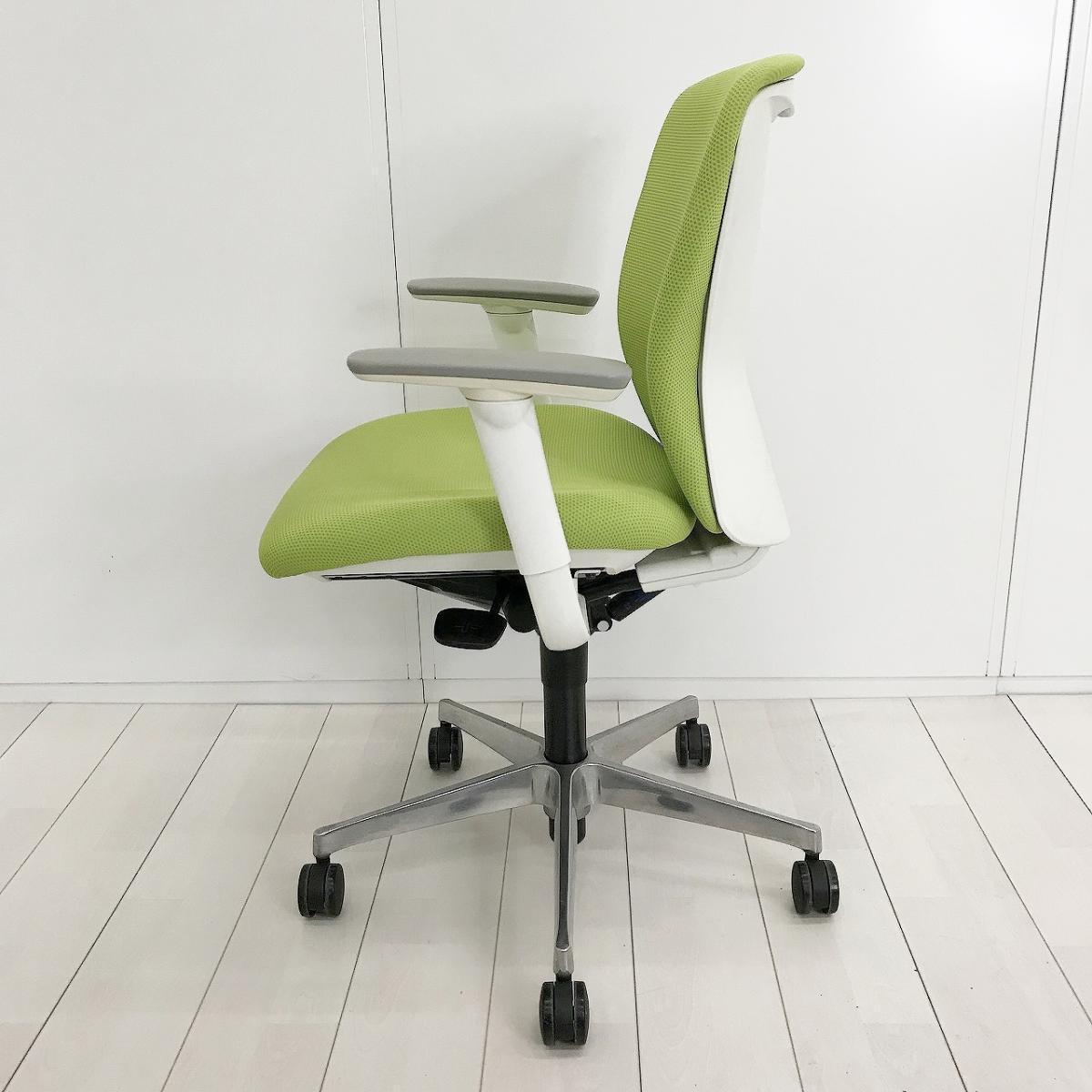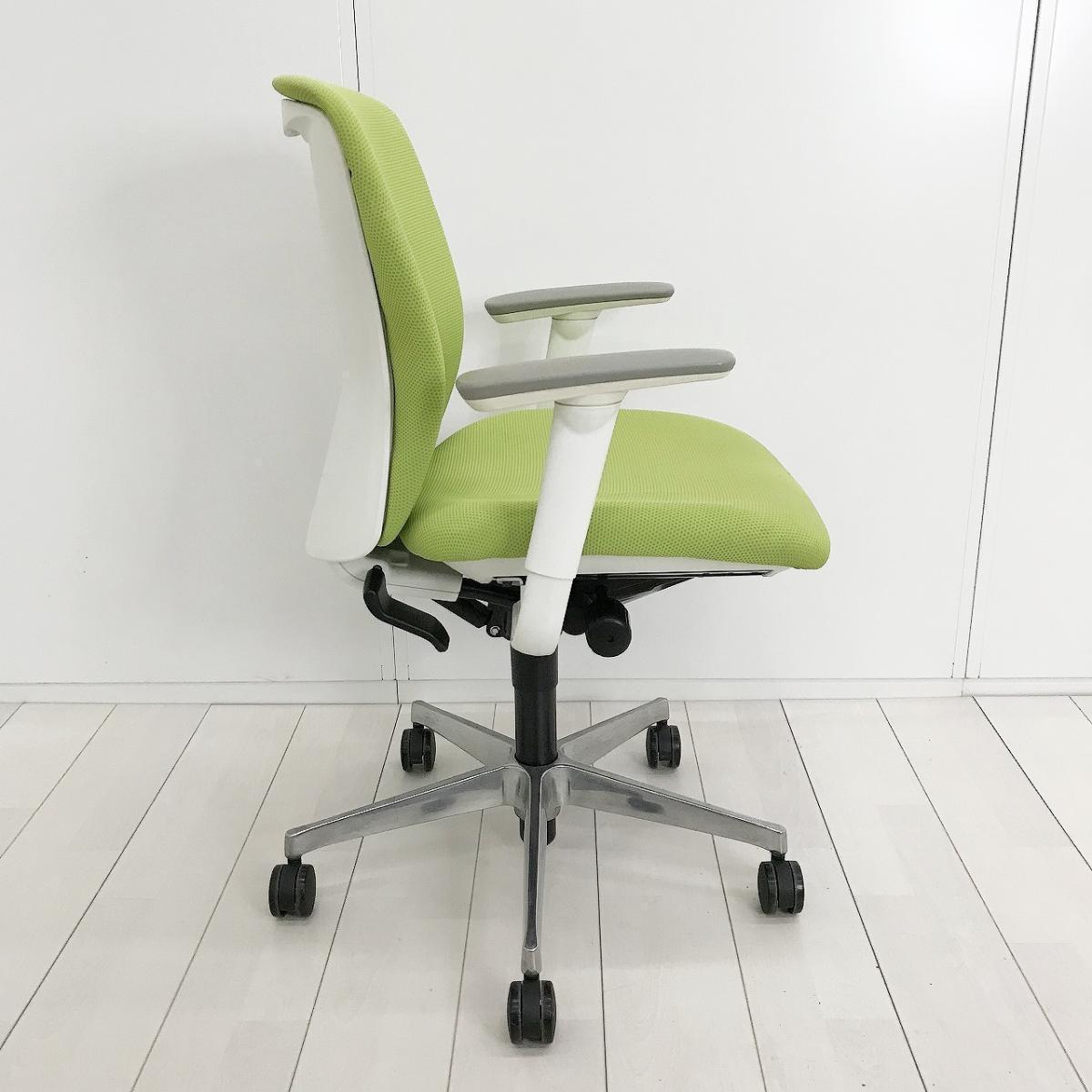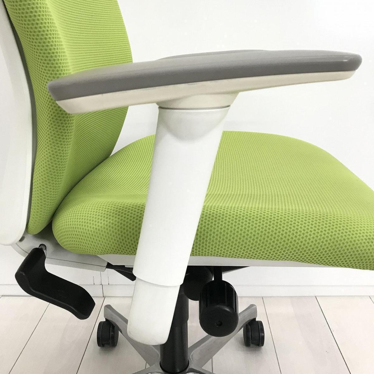 ■オカムラ(okamura)製 スラート(sulato)チェア 肘付 ローバック クッションタイプ ■可動肘・ハンガー付き ■ライムグリーン×ホワイトシェル