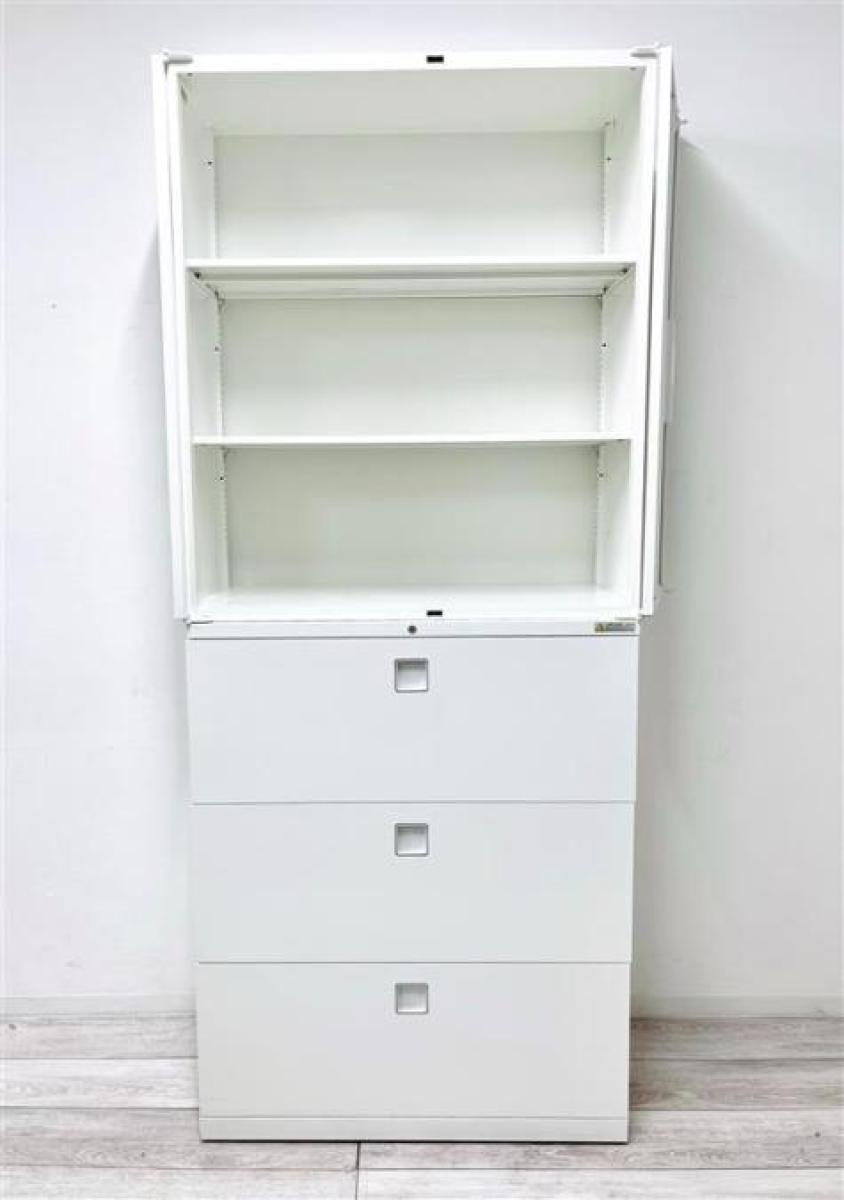 【お問合せ多数の商品ですのでお早めに!】■オカムラ製 レクトラインシリーズ 上下書庫セット 両開き+3段ラテラル ホワイト
