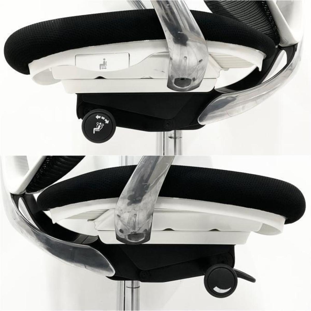 - 椅子と背が連動する「シンクロリクライニング」。リクライニング角度は直立ポジションから前方に10度、後方に23度です。