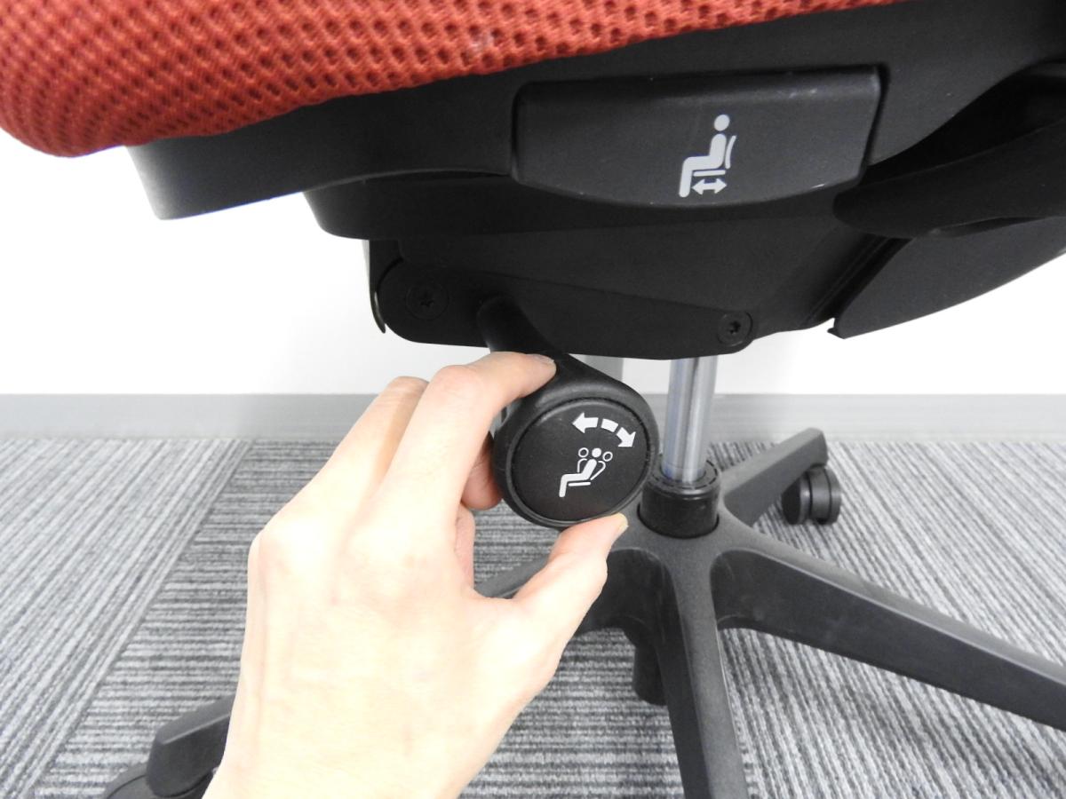 - 座面右下のダイヤル操作で、リクライニングの強弱調整が行えます。これまでのダイヤル式よりも、少ない回転数で、最弱?最強の調整が可能です。