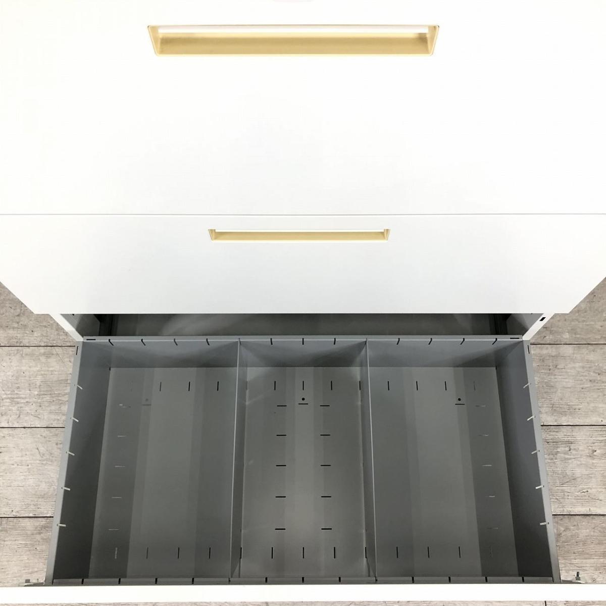 ボールスライドレールを採用したラテラルの引出しは、収納物をスムーズに出し入れでき、