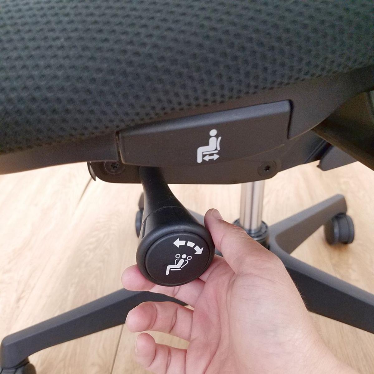 - 座面左下のダイヤルでリクライニングの固定と解除が行えます。 前傾ポジションをとることも可能です。