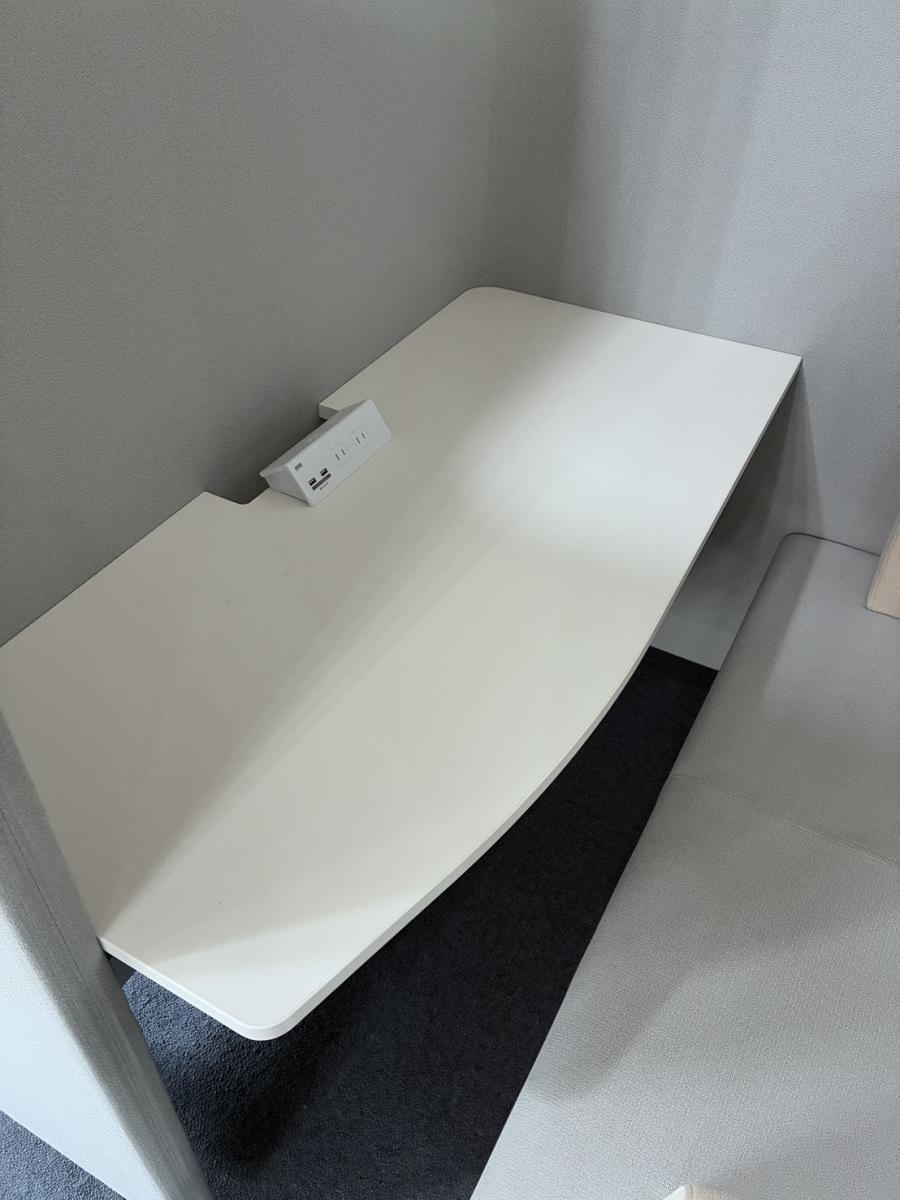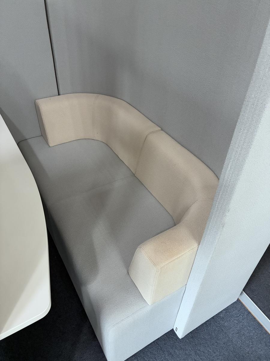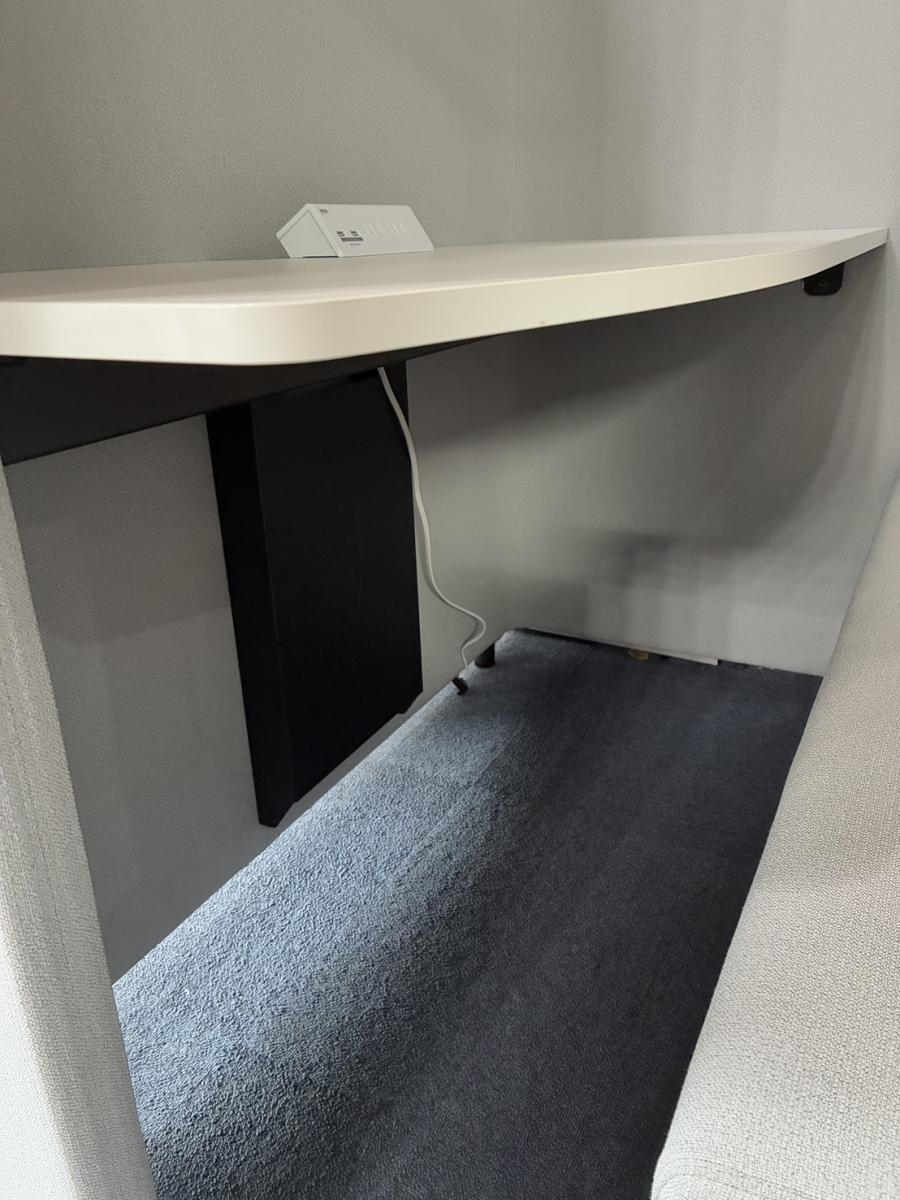 Bracketsシリーズの魅力は「短時間で深い集中に入れる環境」を提供できる点です。吸音性を考慮したパネルにより周囲の雑音を軽減し、オンライン会議や資料作成など静かな作業に最適。ソファはやや硬めで体をしっかり支えてくれるため、長時間でも疲れにくく、天板はノートPC・資料・飲み物を余裕を持って置ける実用的なサイズです。高価格帯モデルのため造りが非常に丁寧で、中古でも満足度の高い商品です。来客時の簡易打合せブース、集中席、個別学習席、コワーキングの個室代替など、多用途で活躍します。