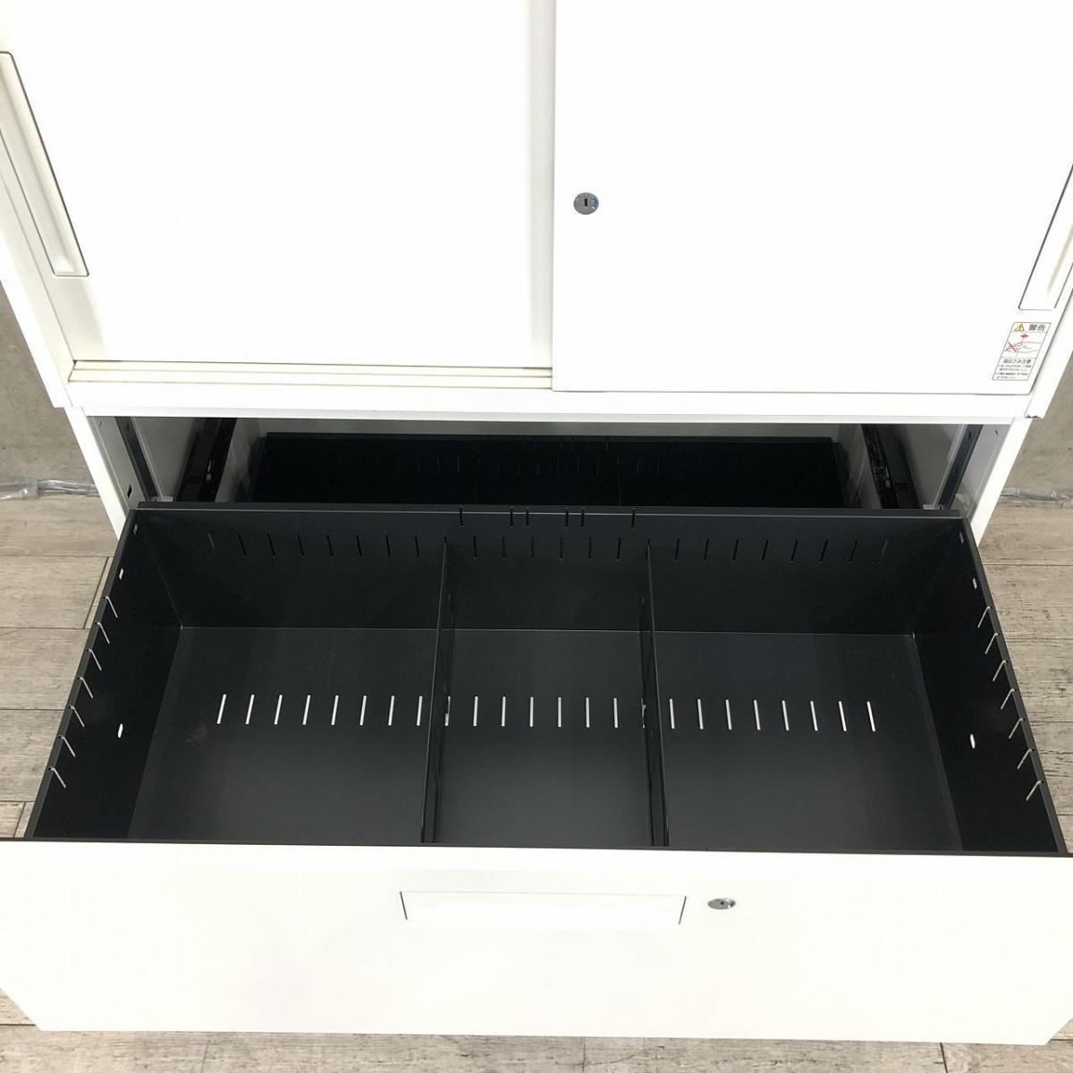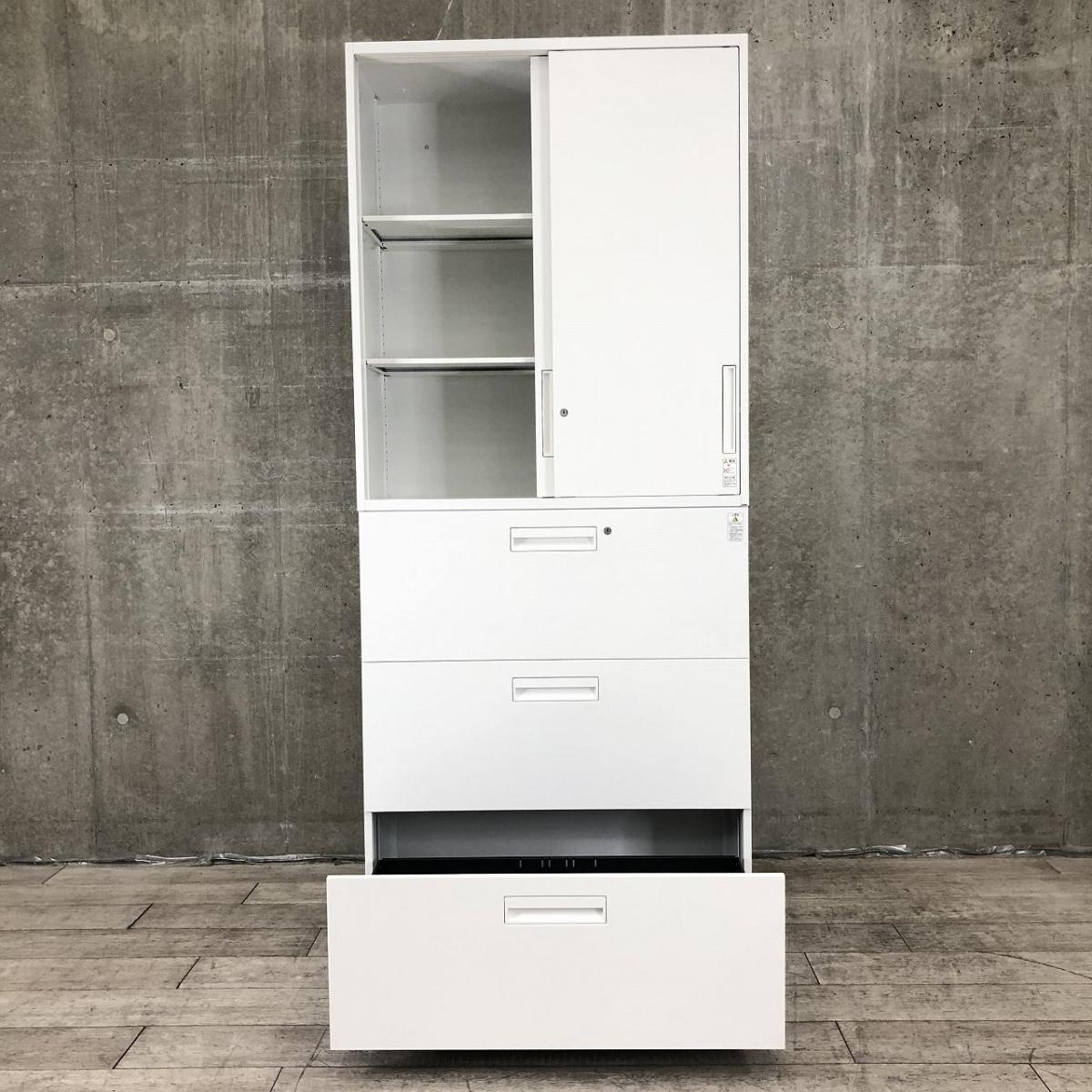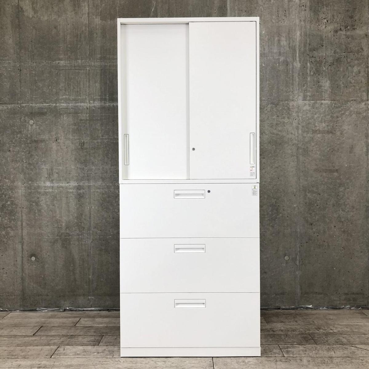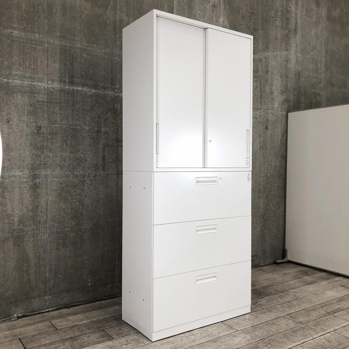 【2台限定】【オフィスの書類をまとめて整理!引き違いと引き出し式の書庫セット!】■コクヨ(KOKUYO)製 エディア(EDIA) 引き違い+3段ラテラル 上下書庫セット 2枚扉 H2150㎜ ■シリンダー錠 ■ホワイト