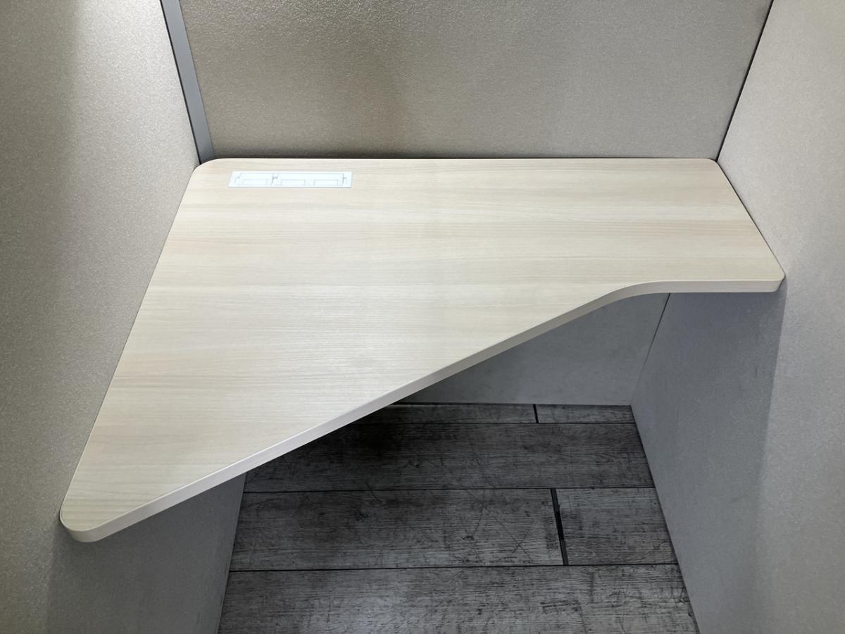 視線がブースの角に向かい、周囲の人の動きが視界に入りにくくなるようにデザインされたワーク天板。