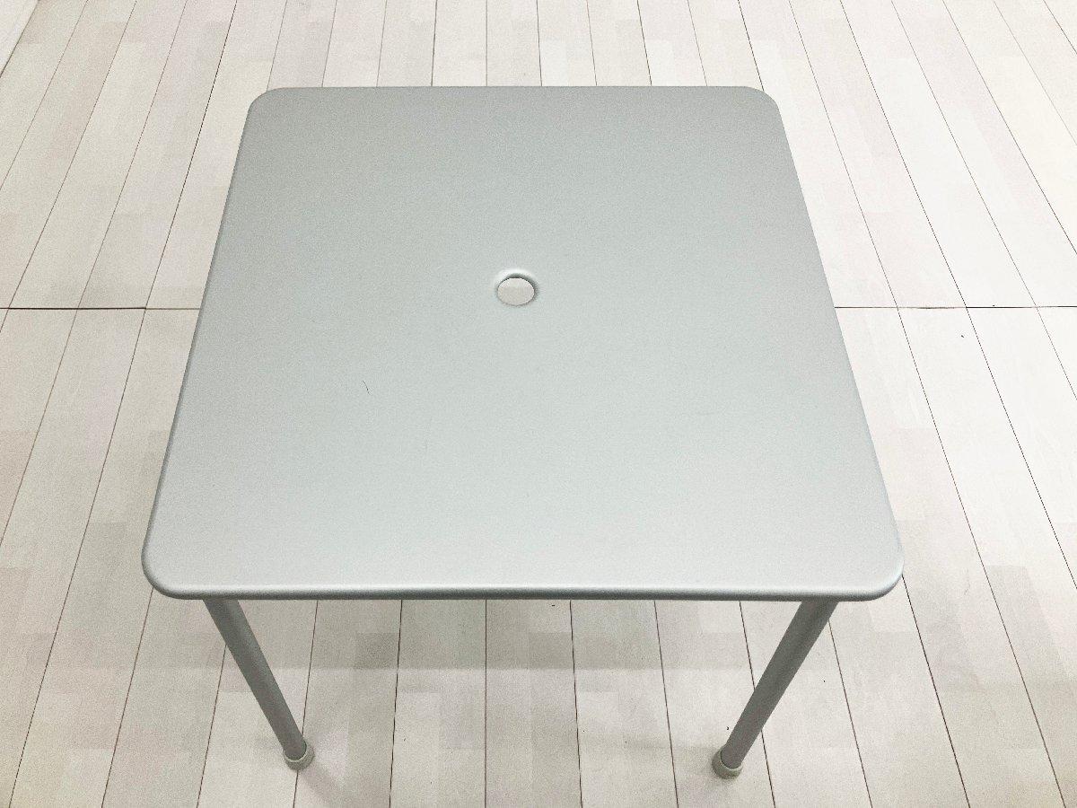 天板中央にはパラソルを固定するためのホールが設けられており、カフェテラスやガーデンスペースなど屋外環境での使用を想定した合理的な設計も魅力。軽量で扱いやすく、住宅から商業空間まで幅広いシーンに対応するテーブルです。
