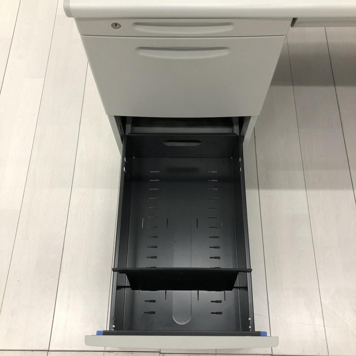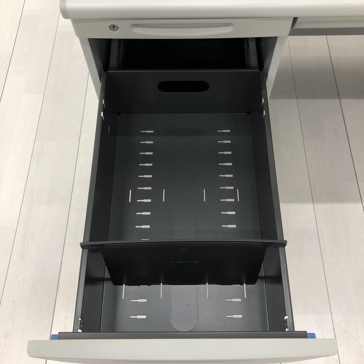 - 袖机のワゴンは、最下段がロング引出しになっており、従来より収納力120%アップ。