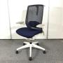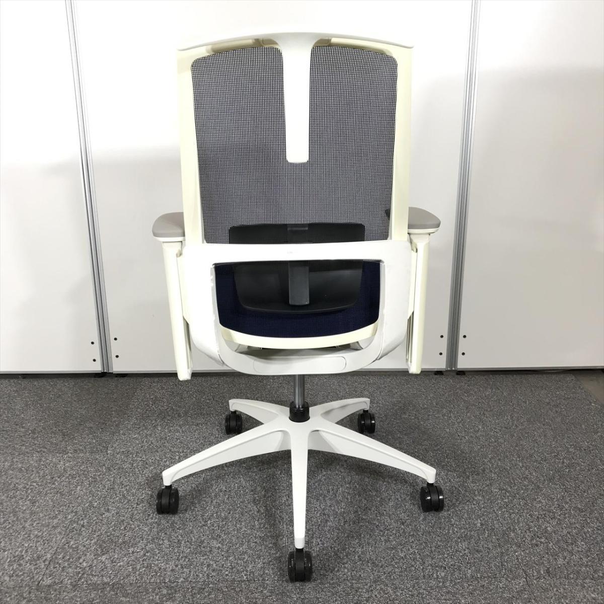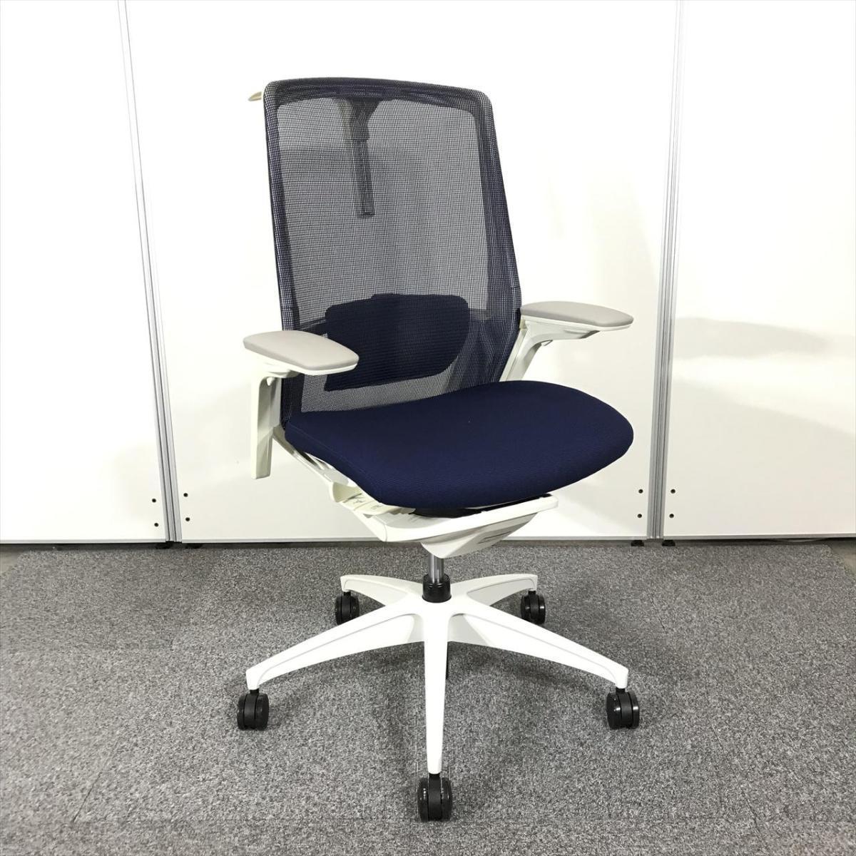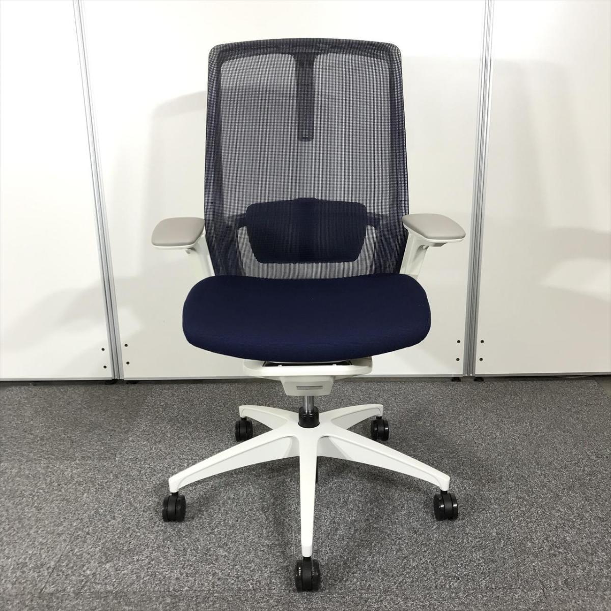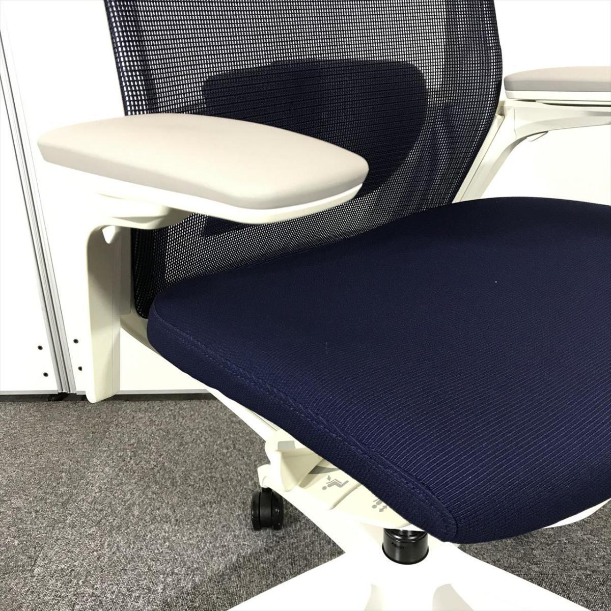 【2021年製で状態良好】オカムラ フィノラ ハイバック 肘付きチェア(アジャストアーム) ダークブルー×ホワイトボディ×ホワイト脚 座クッションの確かな座り心地 コートハンガー&ランバーサポート搭載