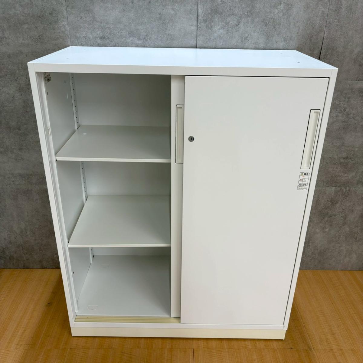 【手狭なオフィスで大活躍!導線を確保できる引き違い戸のキャビネット!】■コクヨ(KOKUYO)製 エディア(EDIA)シリーズ 引き違い書庫 ローキャビネット ■3枚扉 ■シリンダー錠 ■天板・ベース付き ■ホワイト