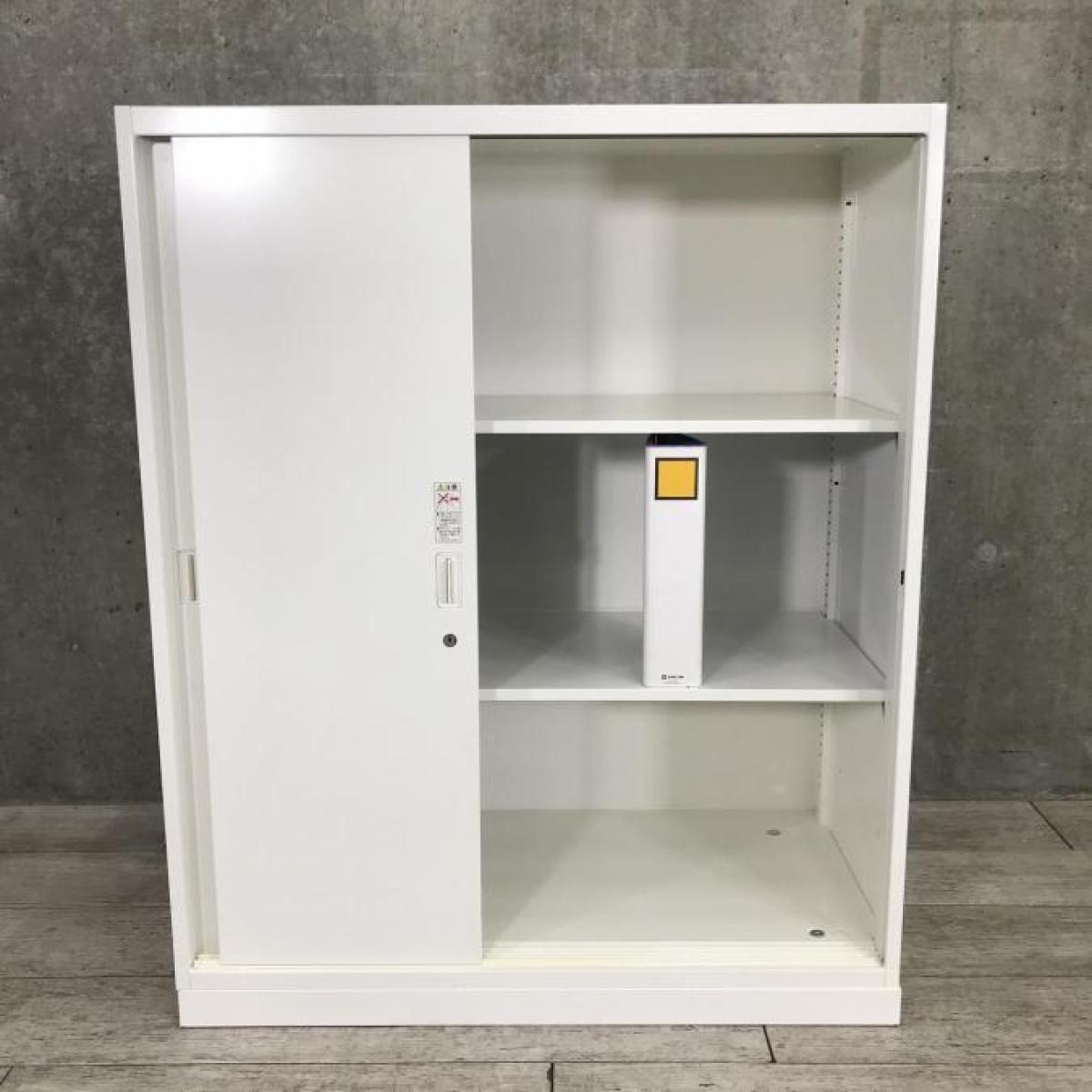 【スライド引き戸だから開閉スペースに困りません!】■オカムラ(okamura)製 レクトラインシリーズ 引違い書庫 2枚引き戸 ローキャビネット ■W900xD450xH1100mm ■ベース付き ■シリンダー錠 ■ホワイト